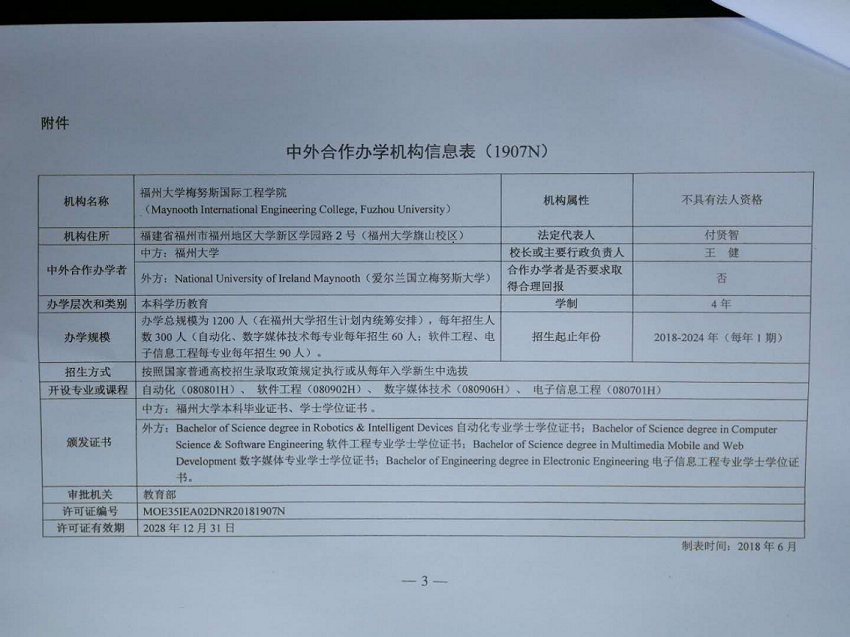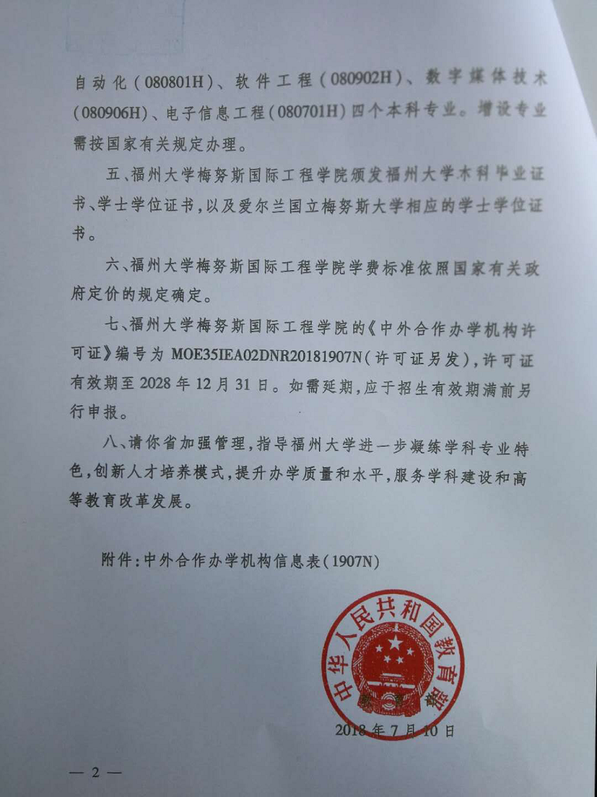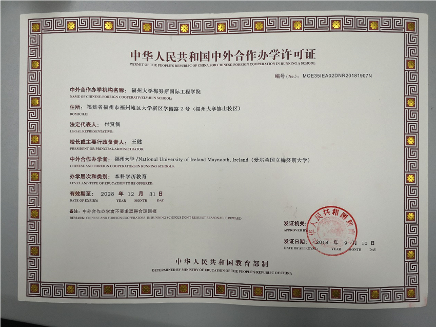 2018年9月10日,中华人民共和国教育部正式向学院颁发《中华人民共和国中外合作办学许可证》。