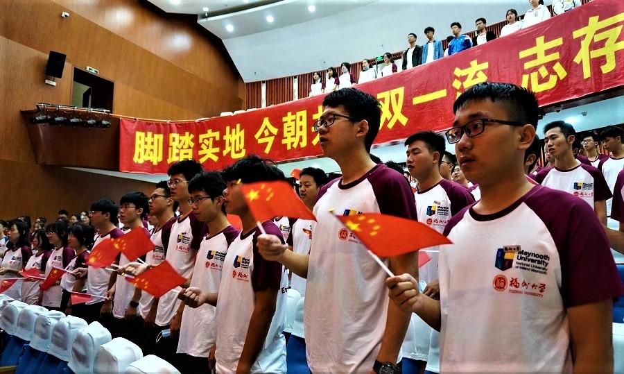 典礼在庄严雄壮的国歌声中拉开序幕。因受疫情防控影响,爱尔兰国立梅努斯大学嘉宾未能莅临典礼,改为视频致辞形式。爱尔兰驻华使馆临时代办Therese Healy(何莉)女士、爱尔兰国立梅努斯大学Aidan Mulkeen副校长以及多位外方教师代表分别向2020级新生的到来表示热烈欢迎,鼓励他们认真学习,在未来勇敢面对挑战,不断提升自我;并同时由衷感谢长期以来学院团队对推动合作项目所做出的贡献。