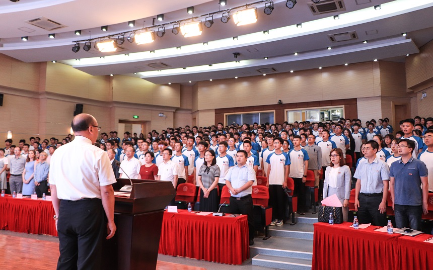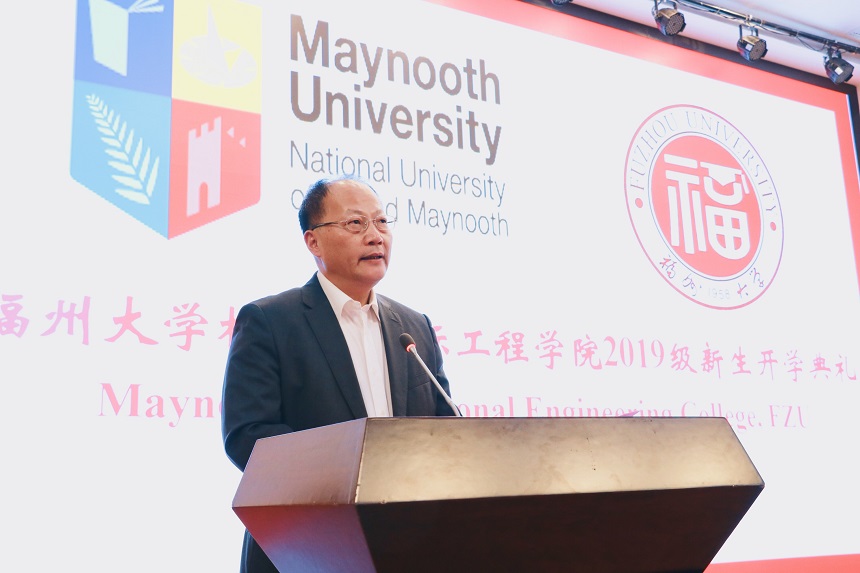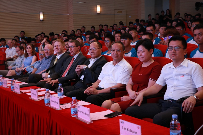 副校长兼学院院长王健,学院外方副院长Ronan·Reilly(罗南·雷利),电气工程与自动化学院何希耕书记、物理与信息工程学院张红书记、数学与计算机科学学院郭文忠院长应邀出席;全体嘉宾与2019级新生及中外方行政人员、中方专业负责人、外方教师齐聚一堂,共同见证学院历史时刻。