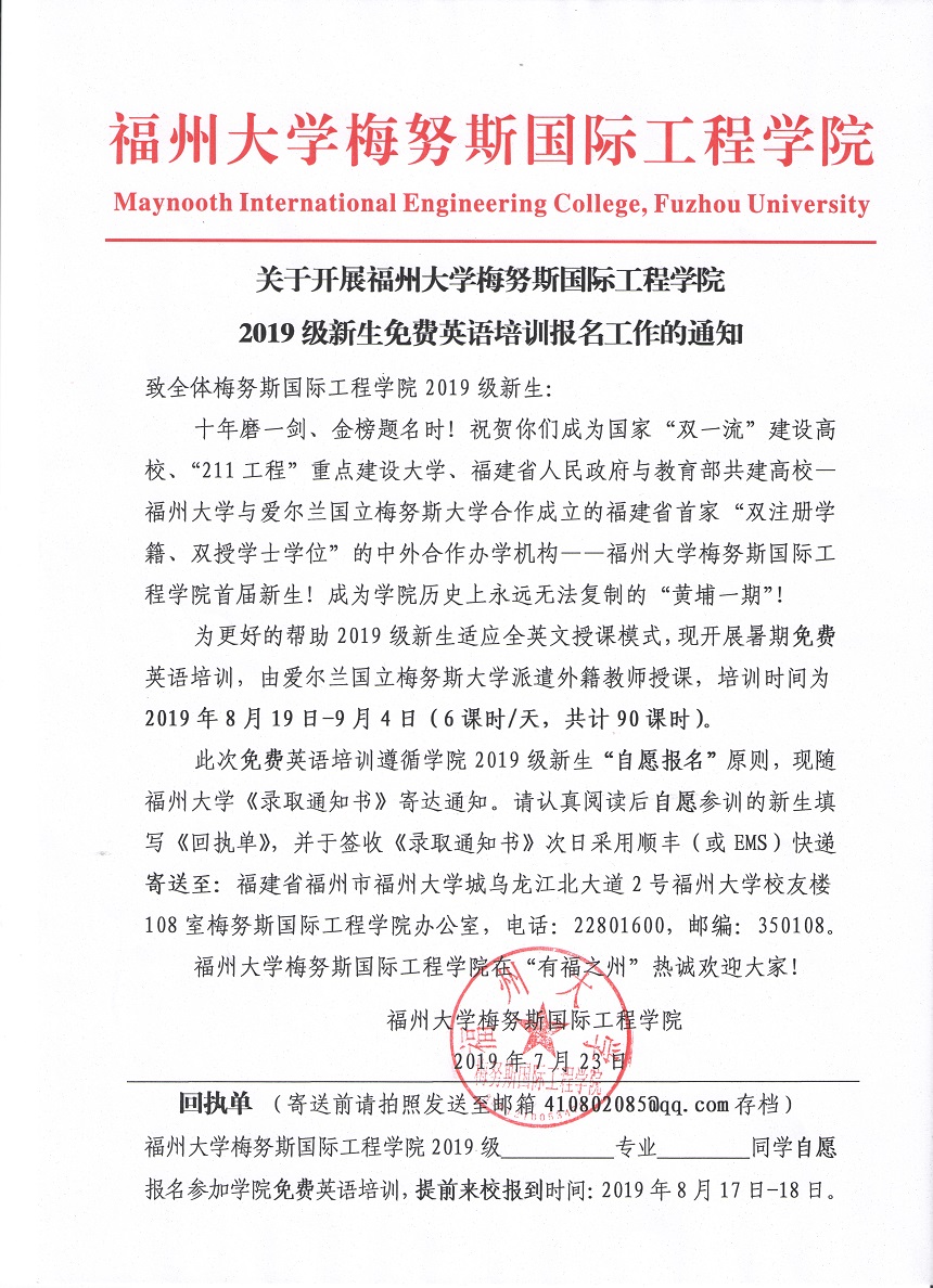 为帮助大家适应全英文授课模式,现学院决定开展免费英语培训,时间为2019年8月19日-9月4日(6课时/天,90课时),遵循“自愿报名”原则。大家收到的兔子先生 《录取通知书》中将会随寄培训报名通知,请自愿报名新生按要求将《回执单》寄回。通知详见下图: