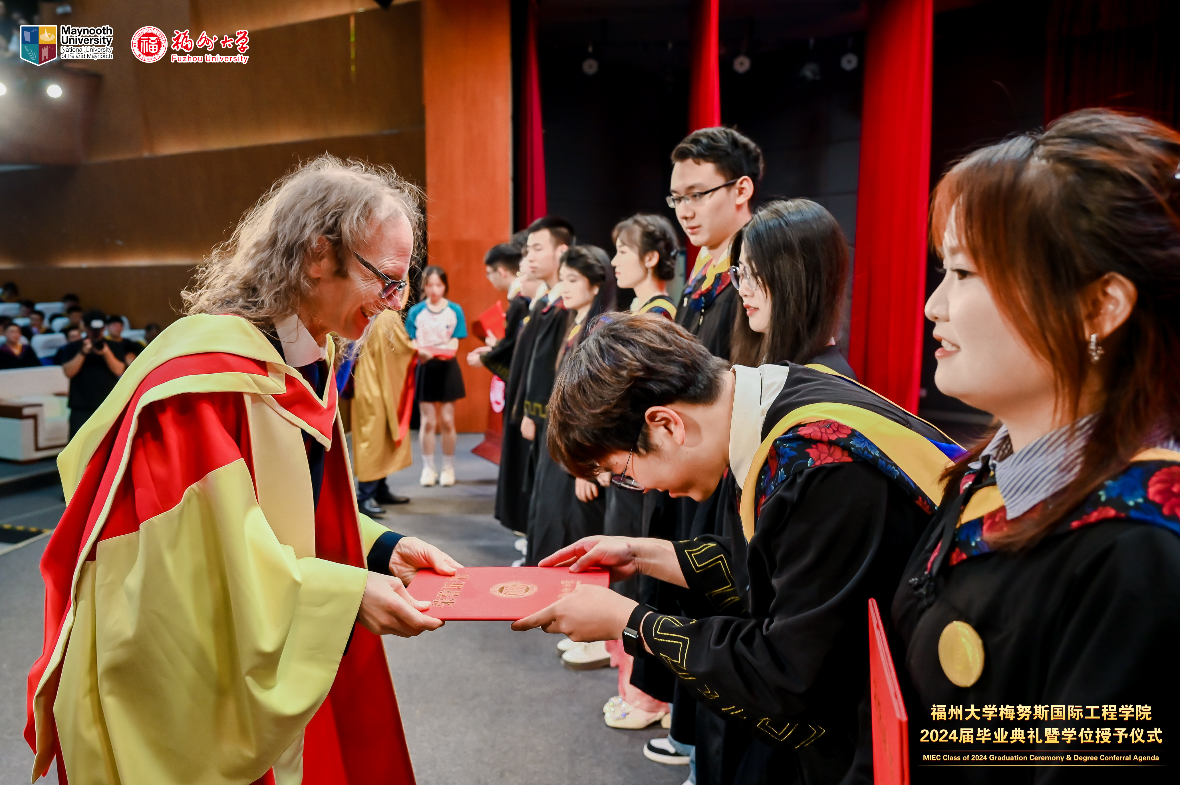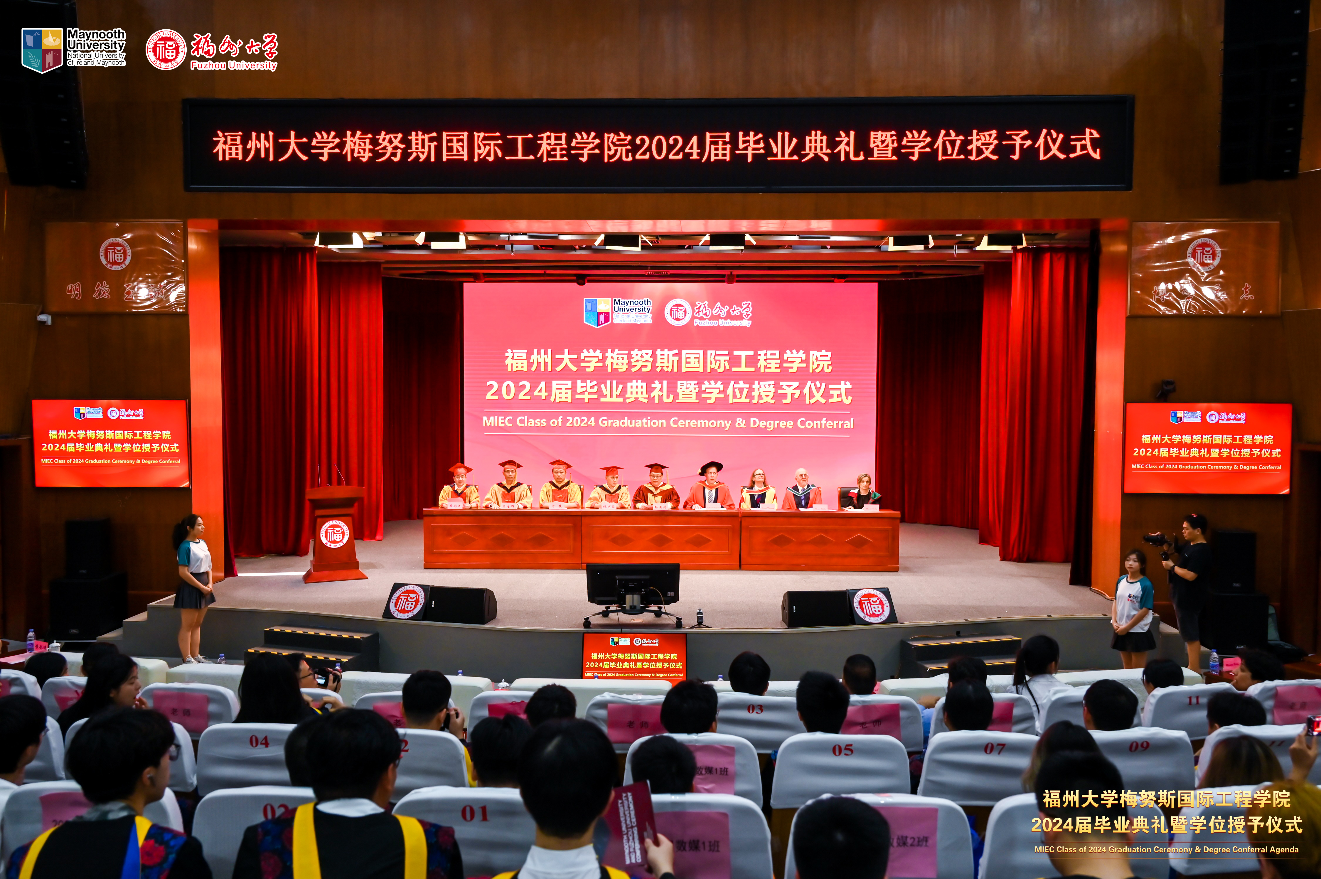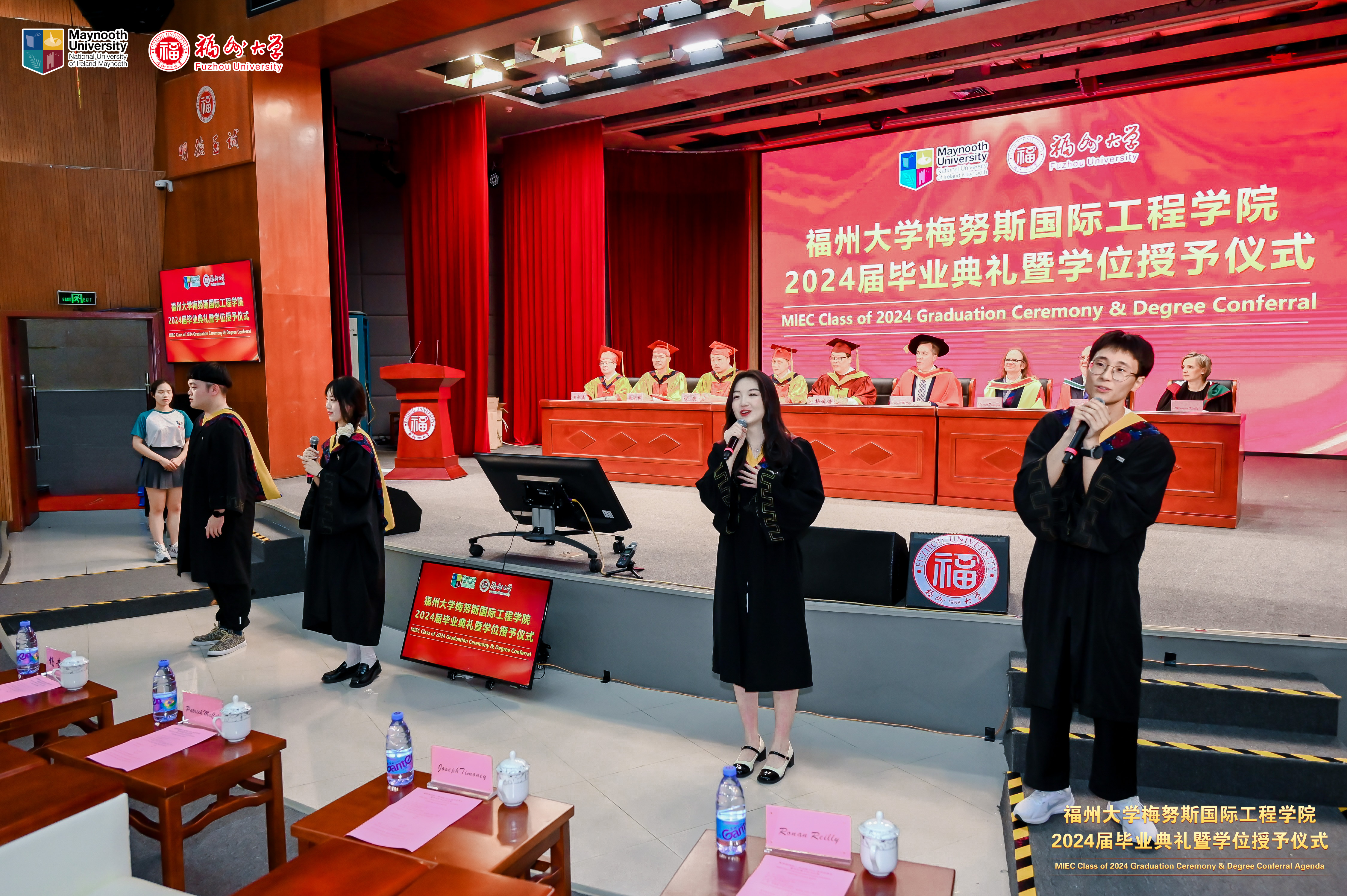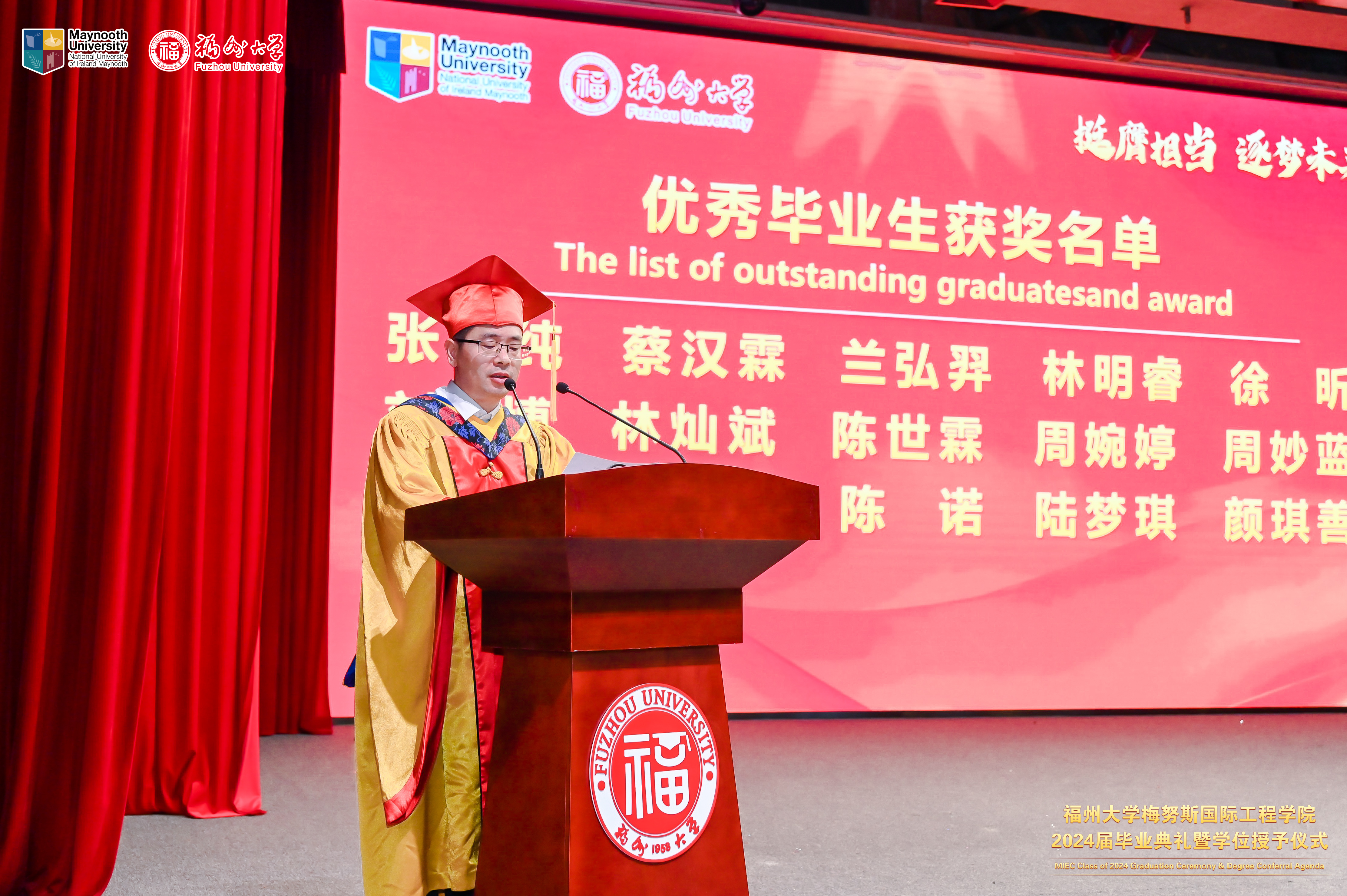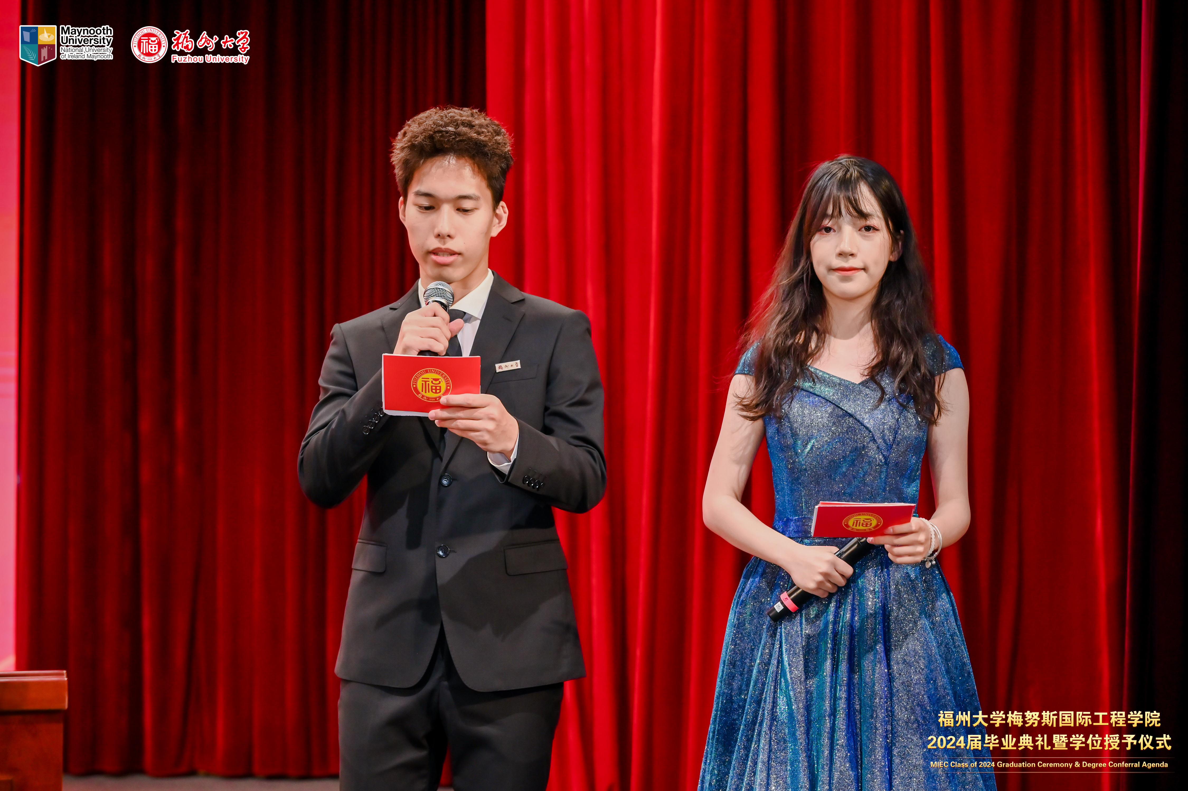 院长杨黄浩教授、学院党委林少骏书记、常务副院长方捷教授、学院党委游生辉副书记、副院长黄彩进教授出席本次典礼。此外,梅努斯大学副校长Patrick McCole 教授率梅努斯大学代表团,不远万里专程出席本次典礼。参加典礼的还有中外方教师、家长代表和全体2024届毕业生。典礼由学生代表张梓浩和郭潇逸双语主持。