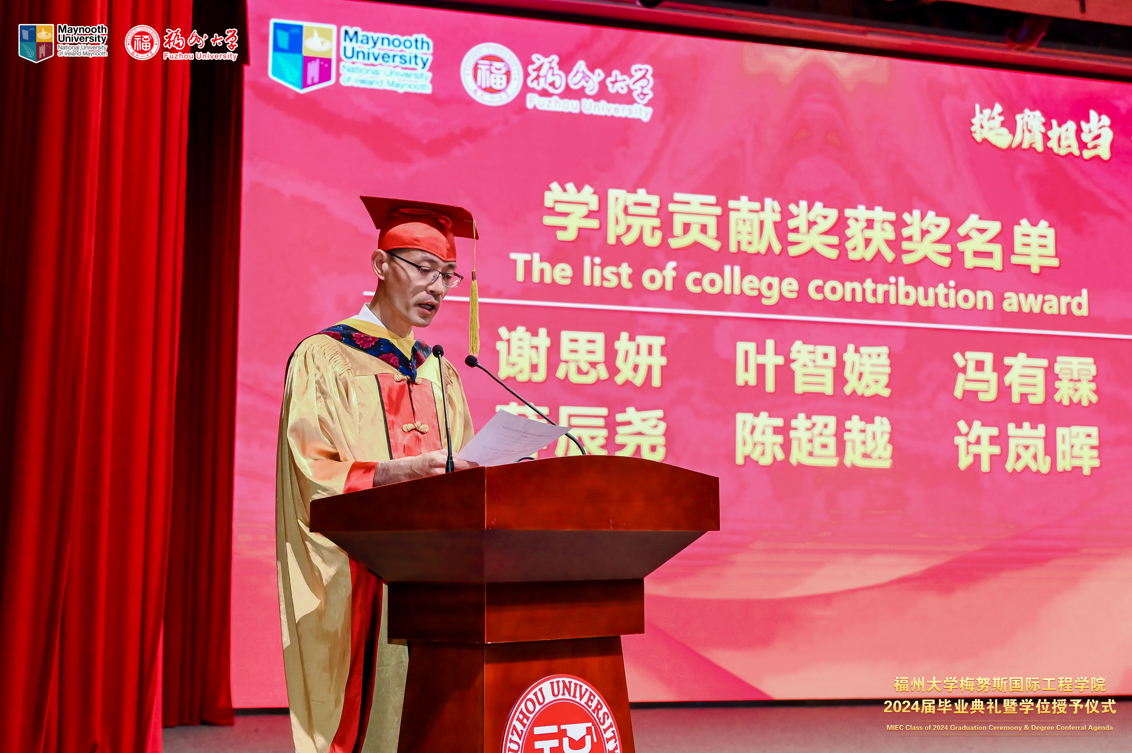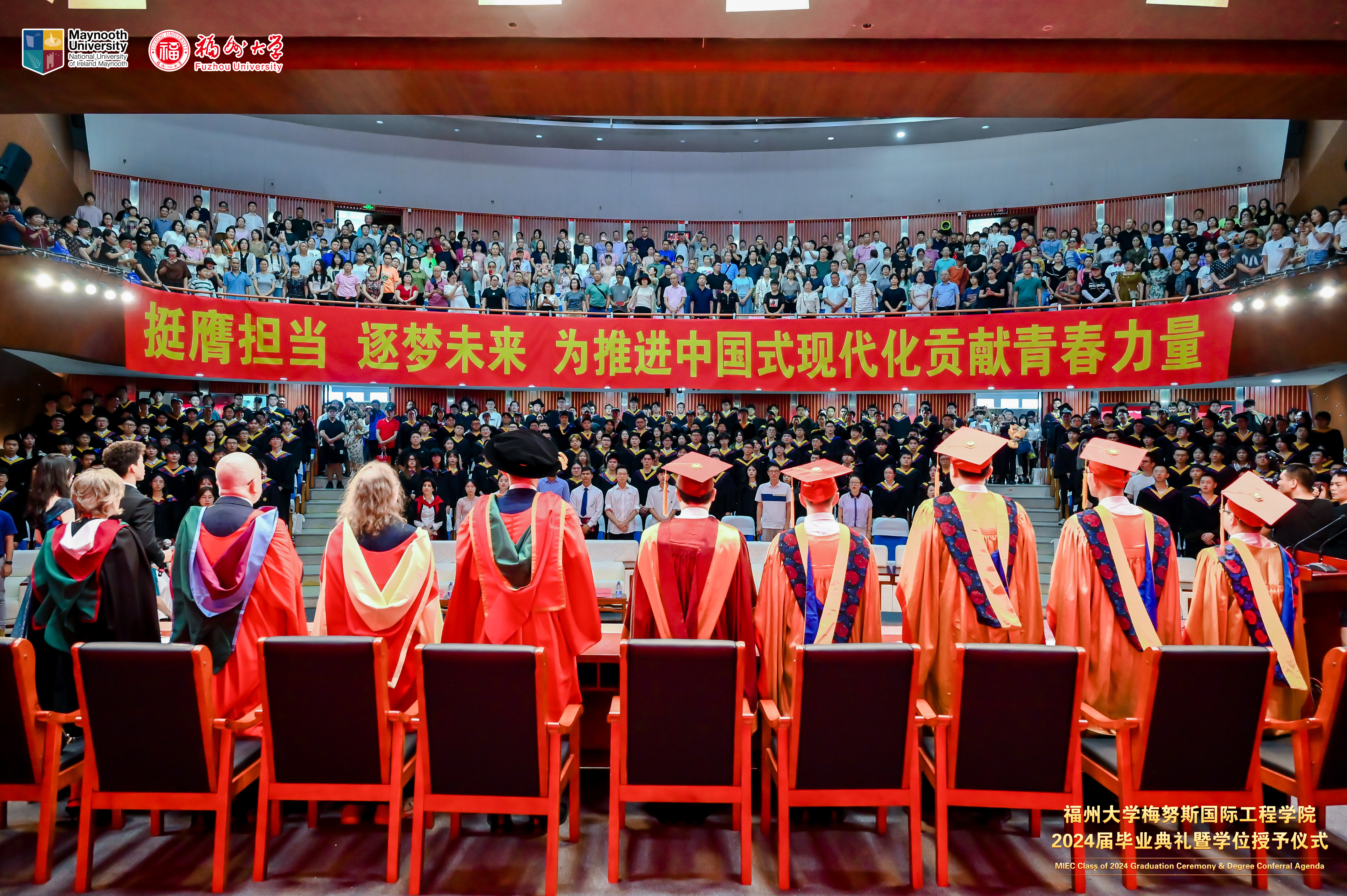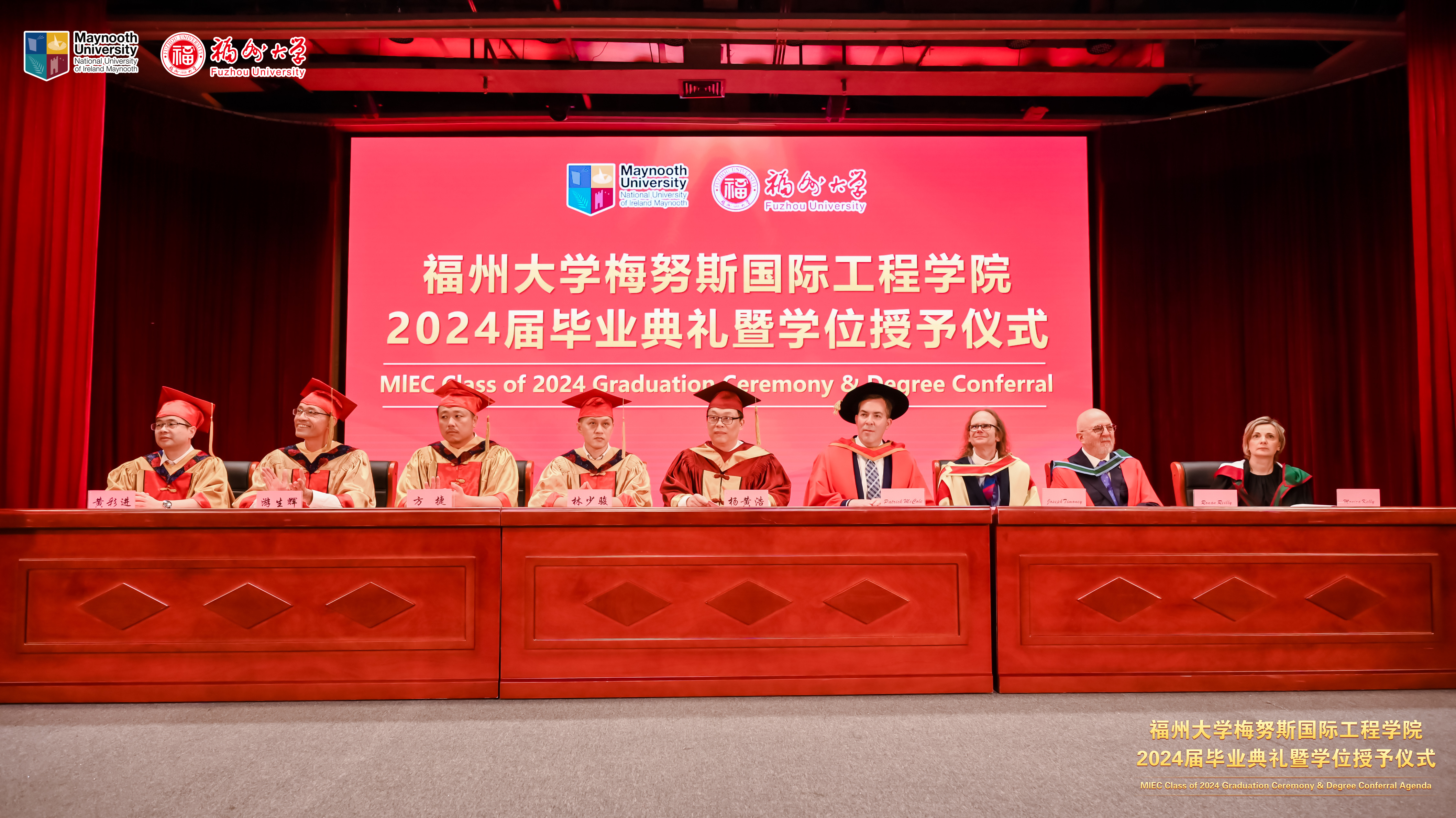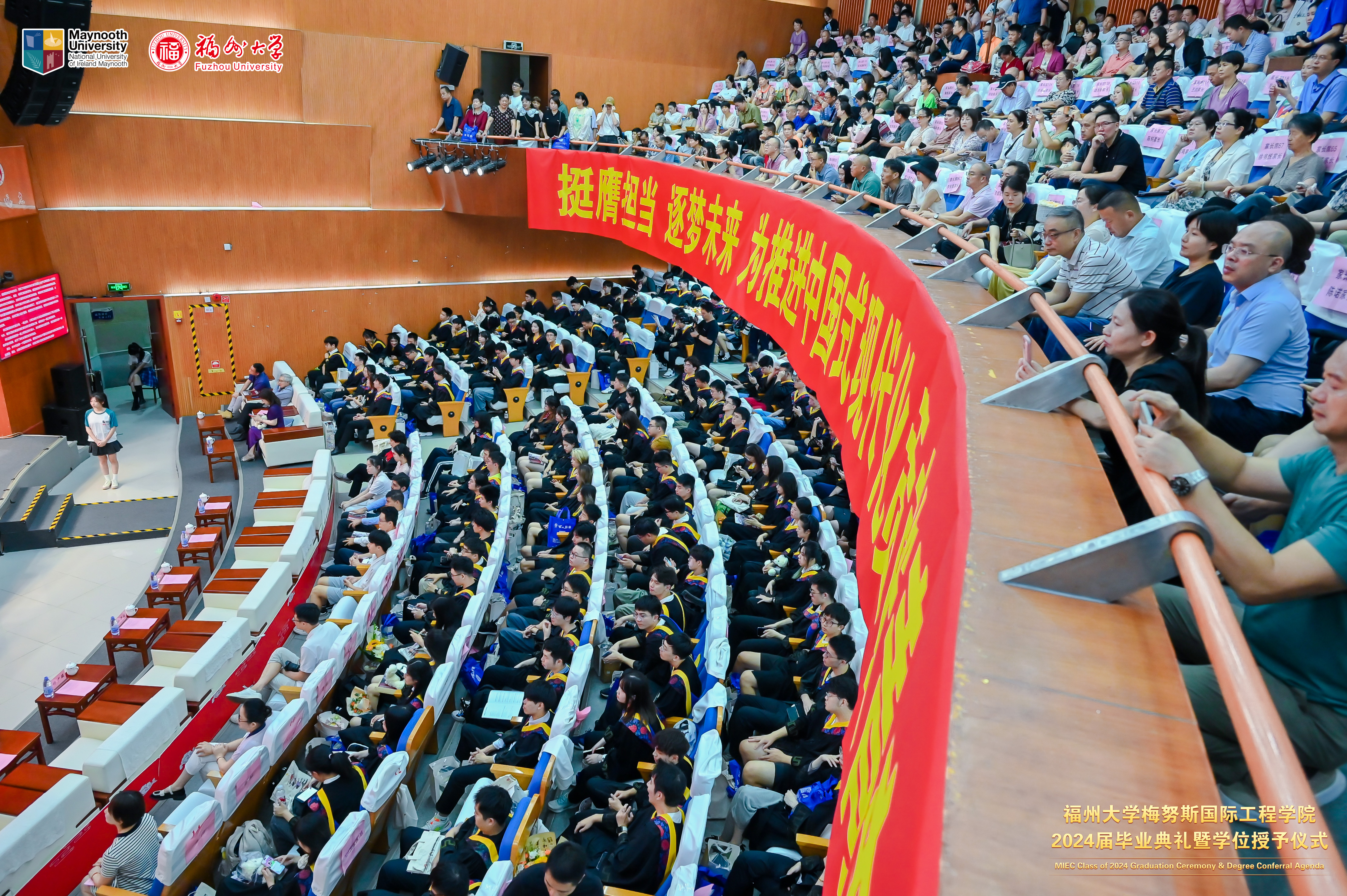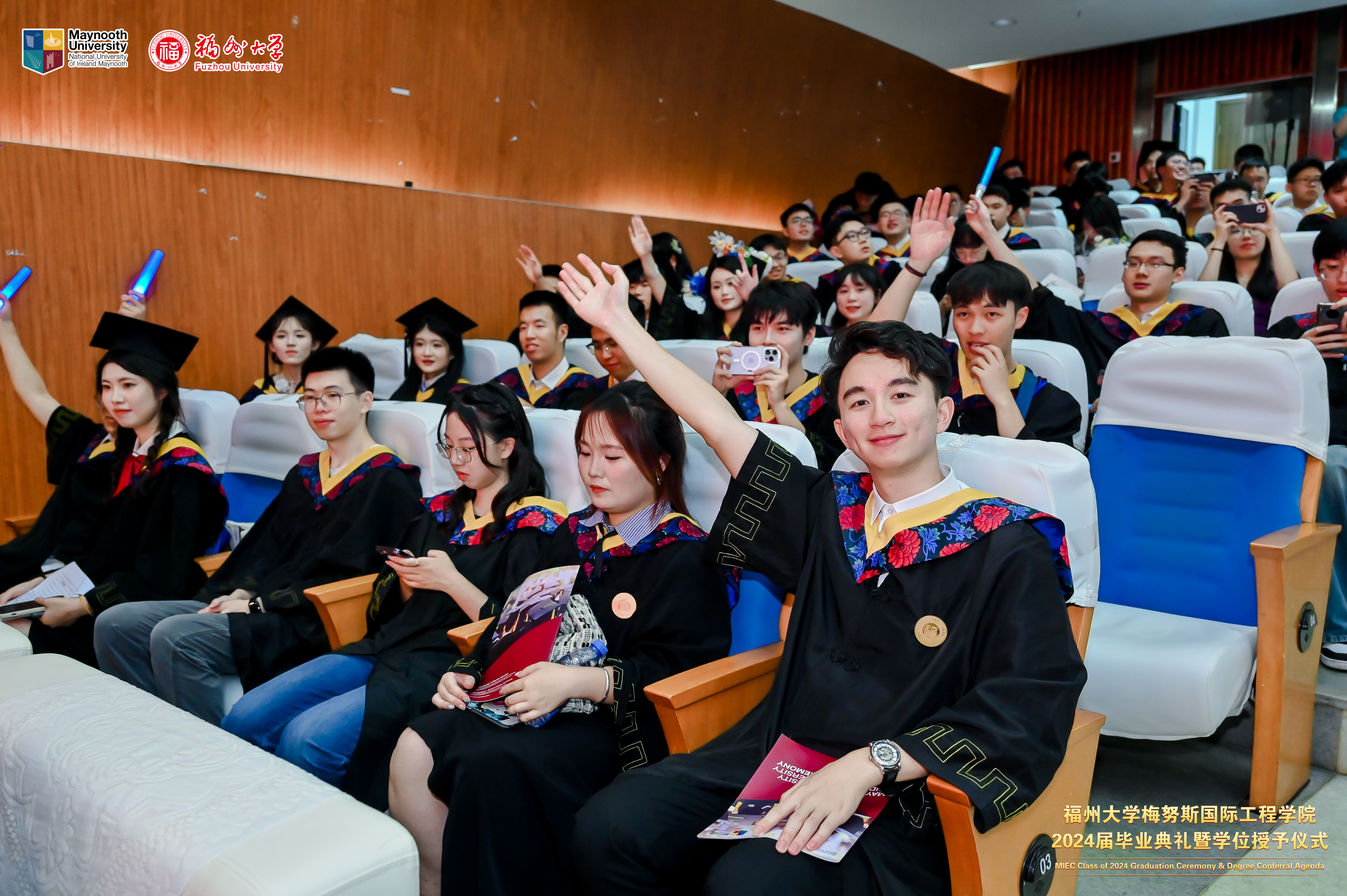 院长杨黄浩教授、学院党委林少骏书记、常务副院长方捷教授、学院党委游生辉副书记、副院长黄彩进教授出席本次典礼。此外,梅努斯大学副校长Patrick McCole 教授率梅努斯大学代表团,不远万里专程出席本次典礼。参加典礼的还有中外方教师、家长代表和全体2024届毕业生。典礼由学生代表张梓浩和郭潇逸双语主持。