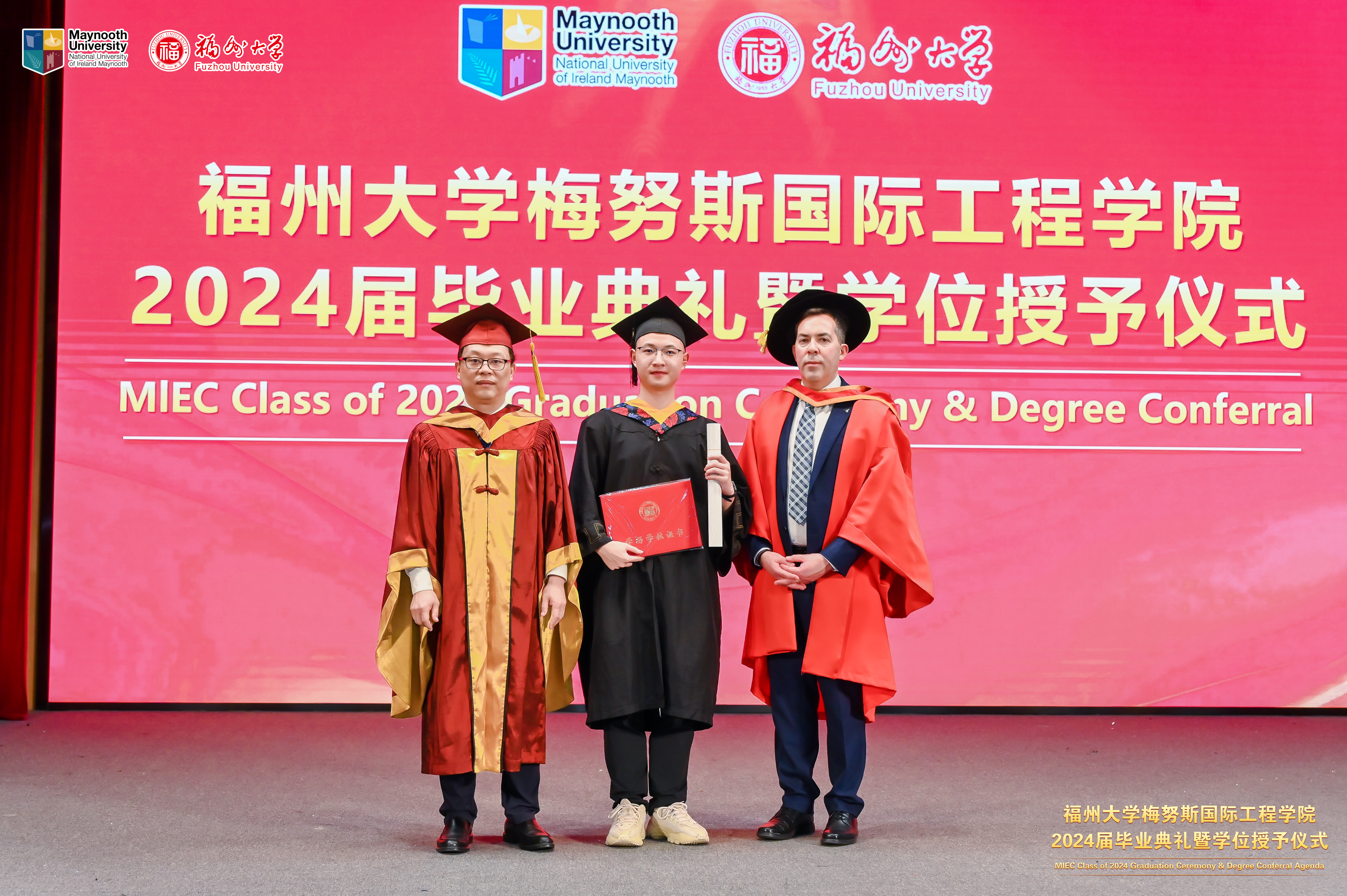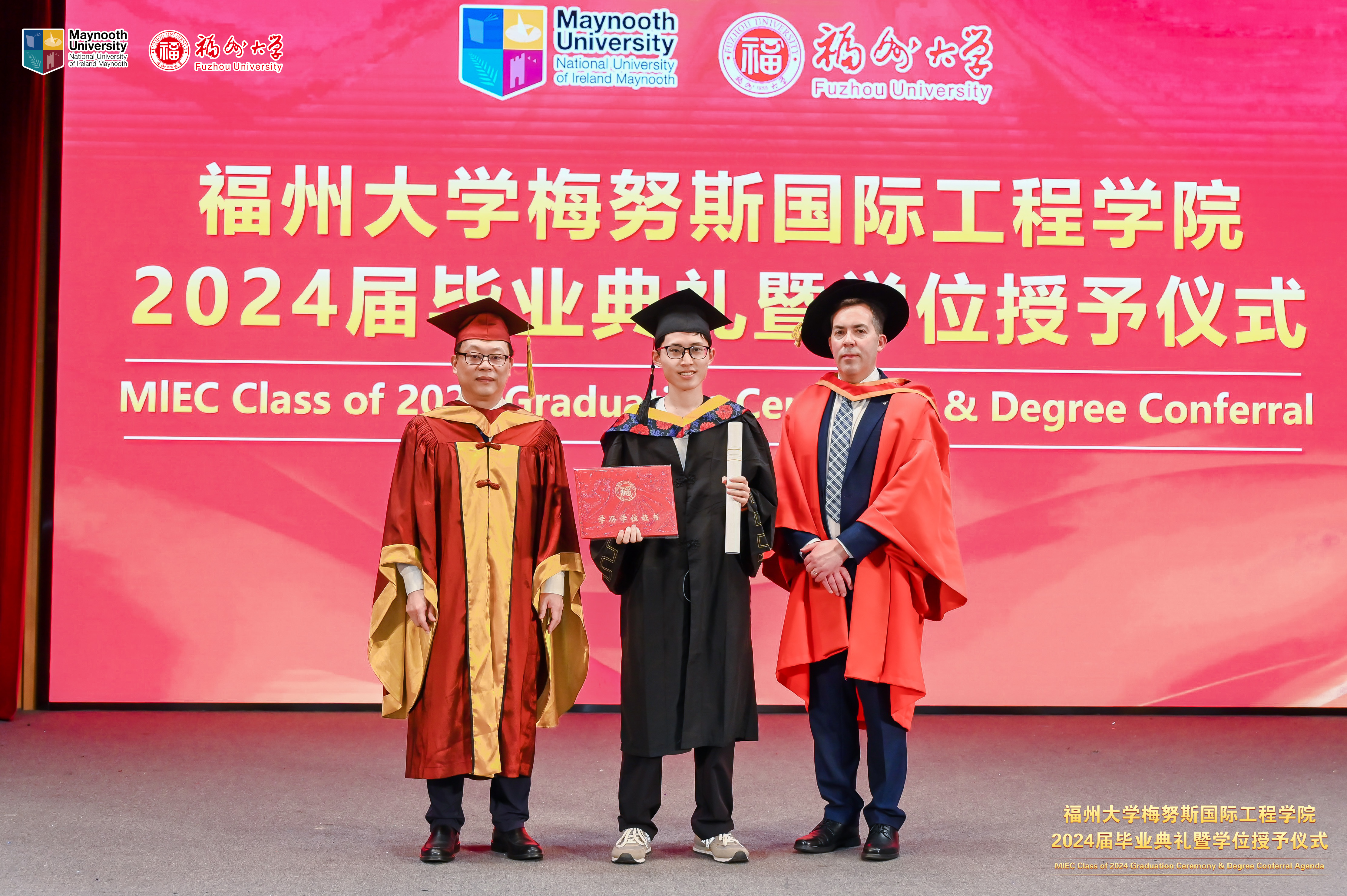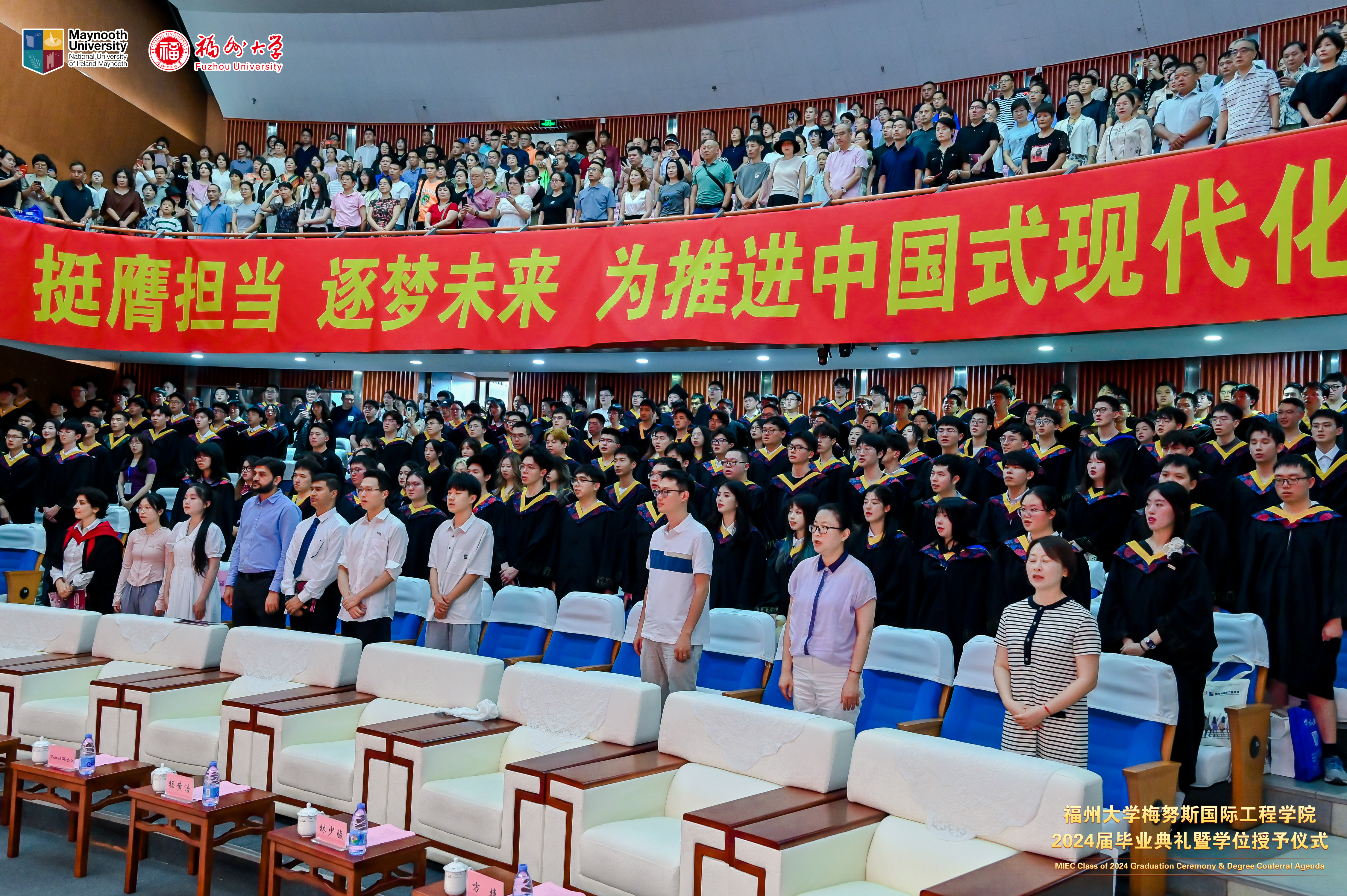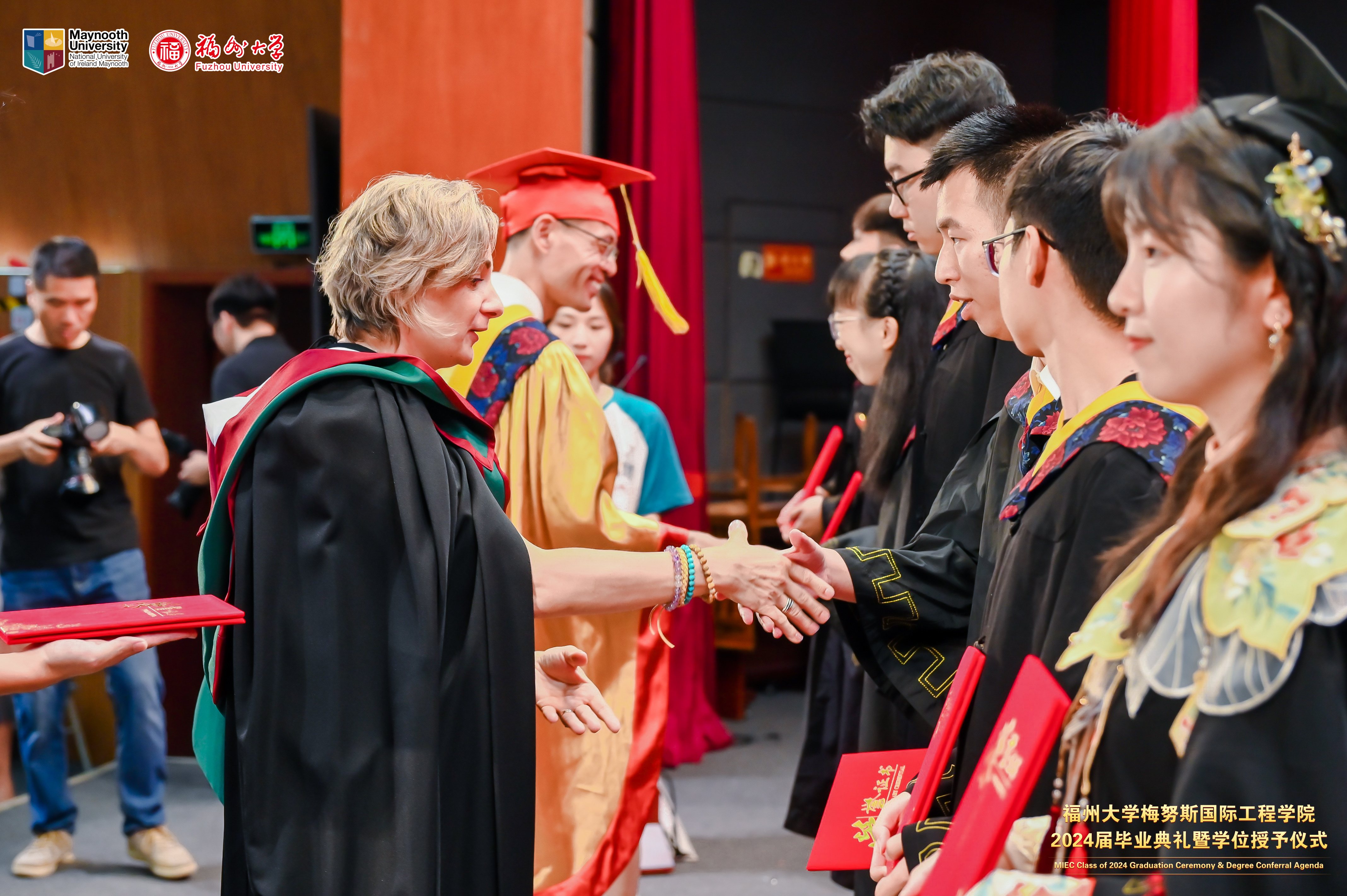 院长杨黄浩教授、学院党委林少骏书记、常务副院长方捷教授、学院党委游生辉副书记、副院长黄彩进教授出席本次典礼。此外,梅努斯大学副校长Patrick McCole 教授率梅努斯大学代表团,不远万里专程出席本次典礼。参加典礼的还有中外方教师、家长代表和全体2024届毕业生。典礼由学生代表张梓浩和郭潇逸双语主持。