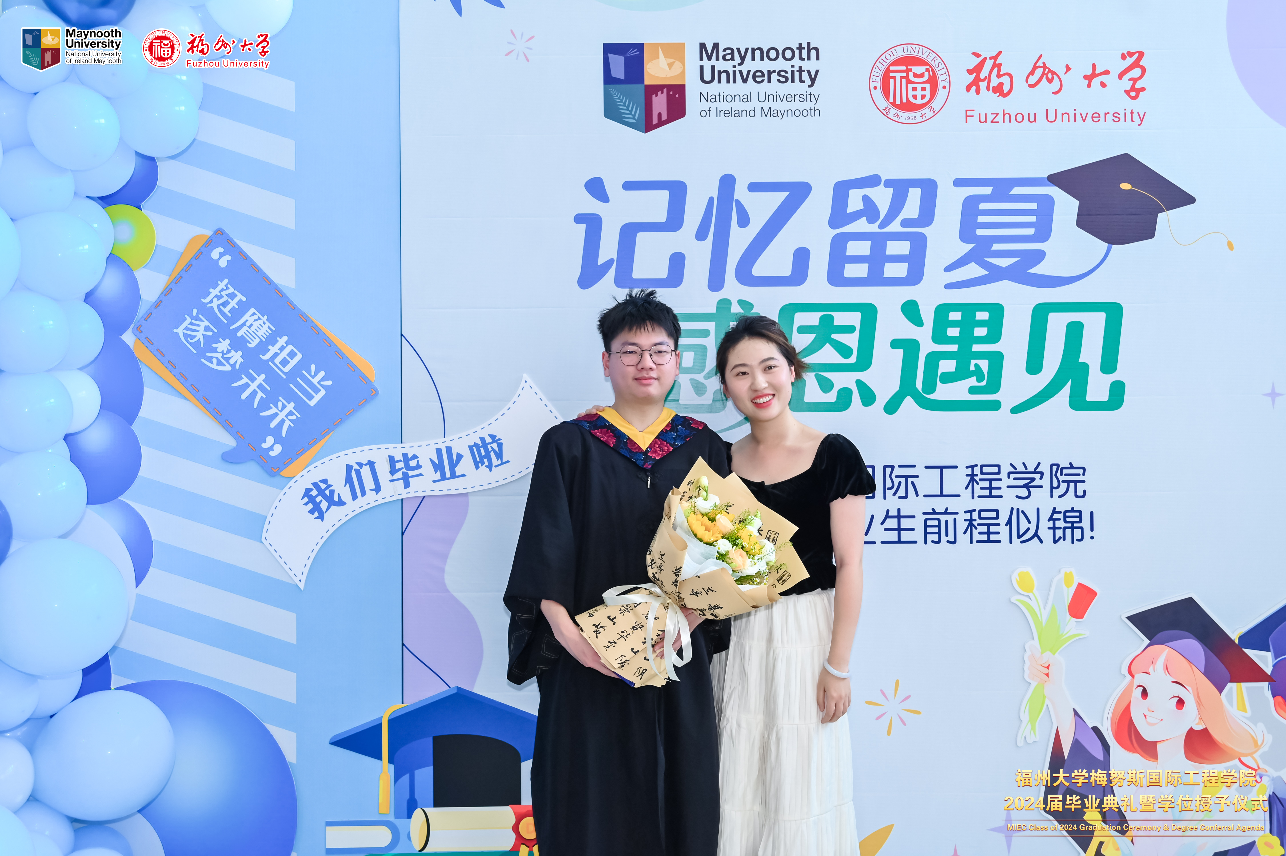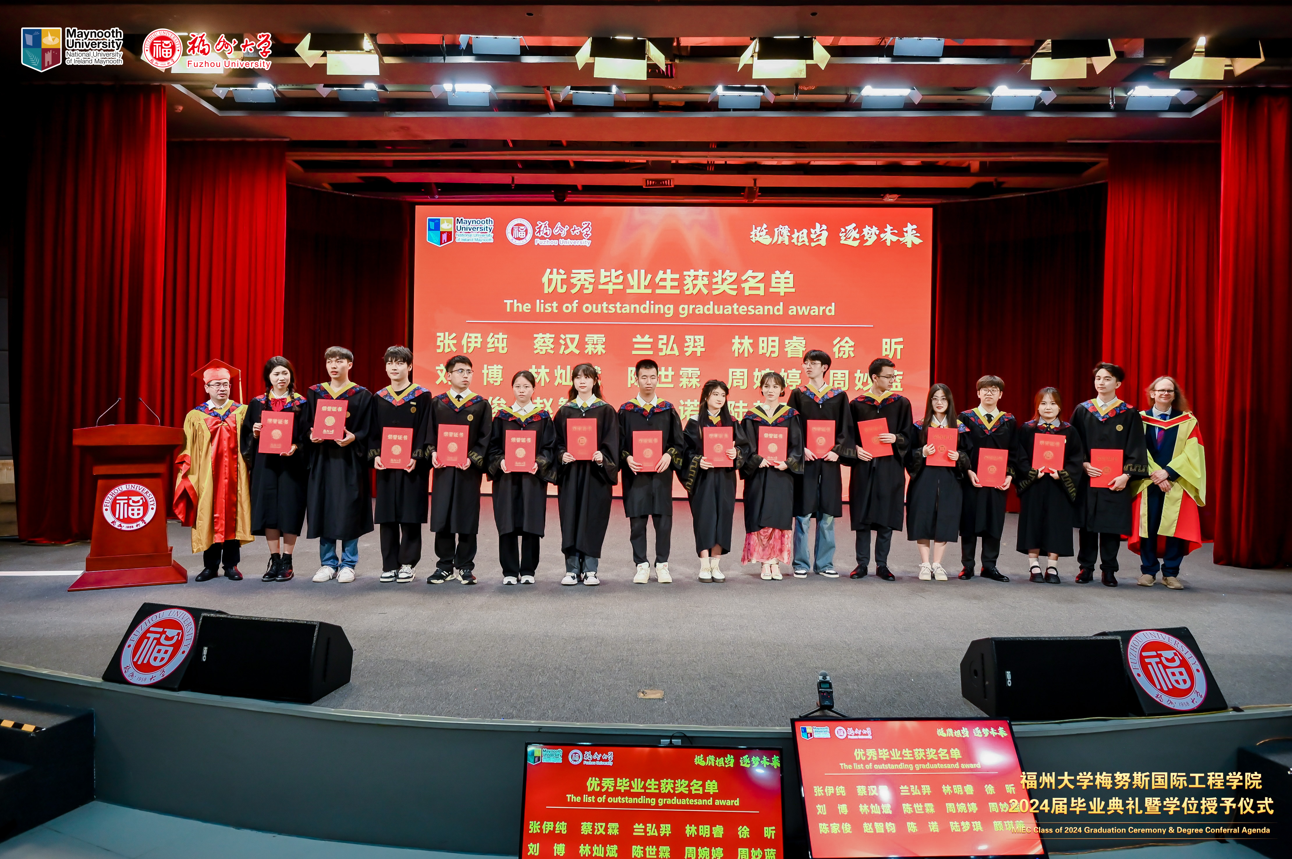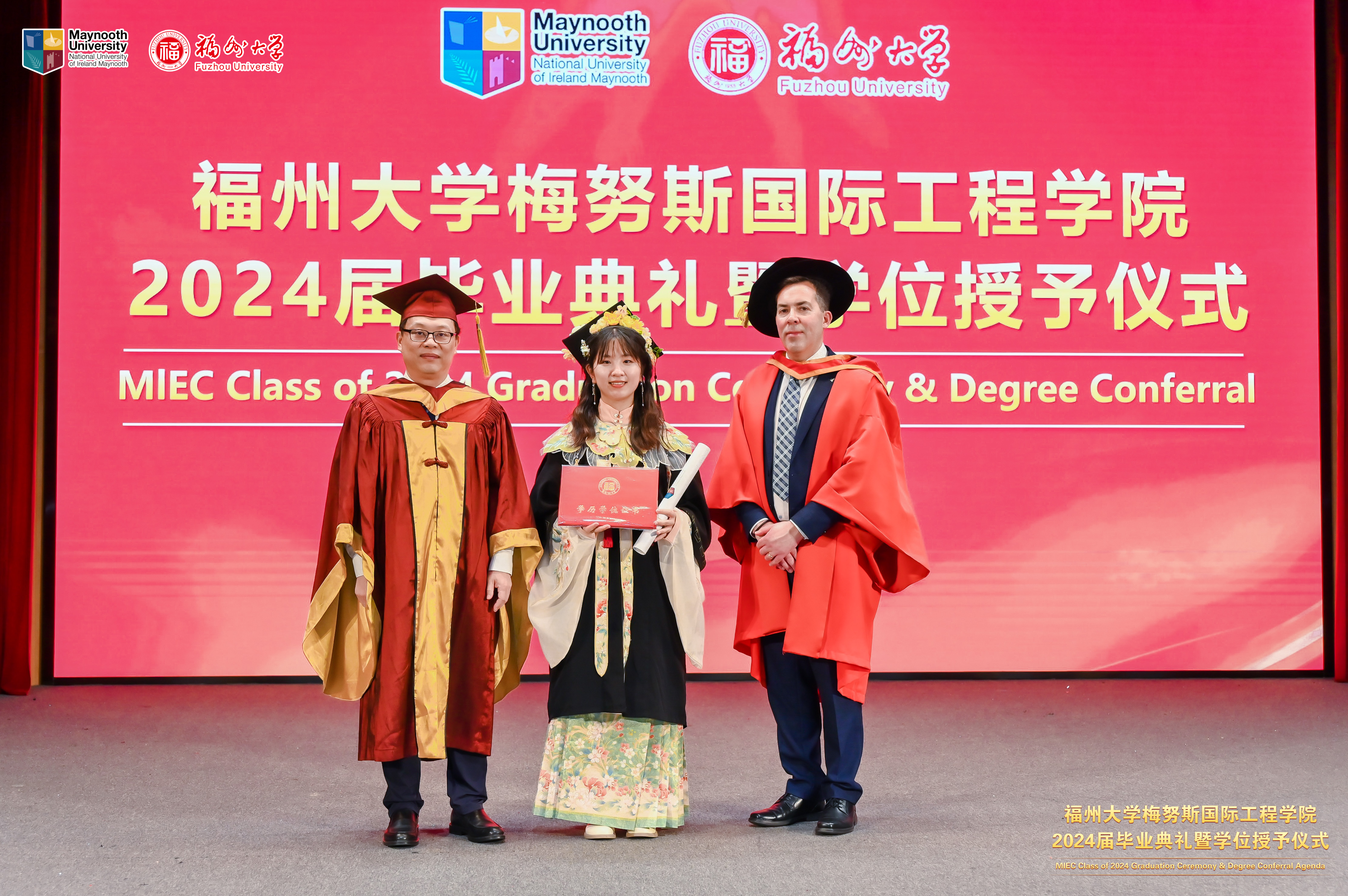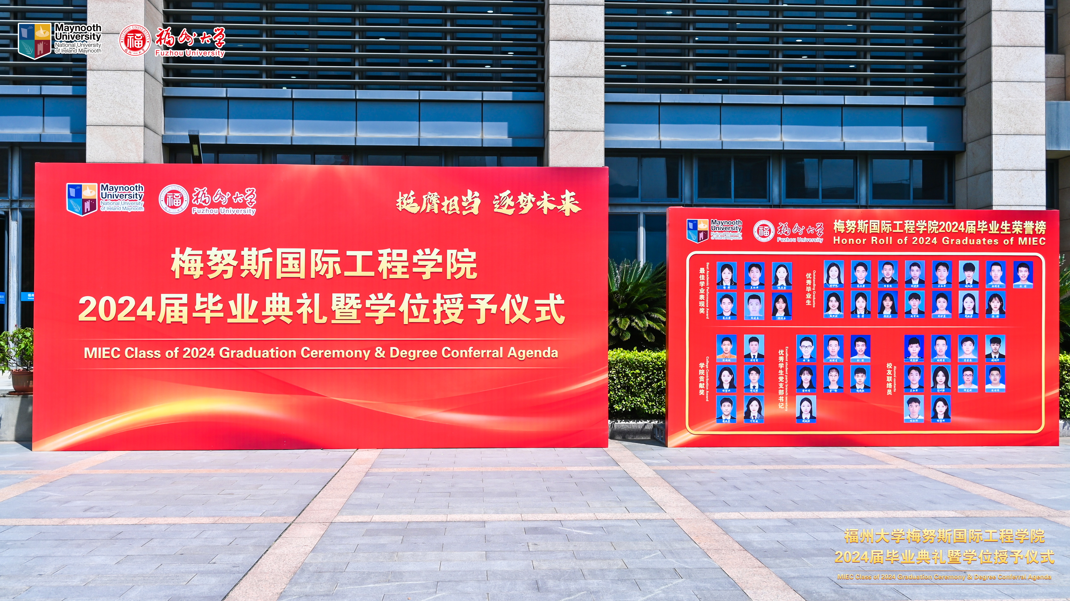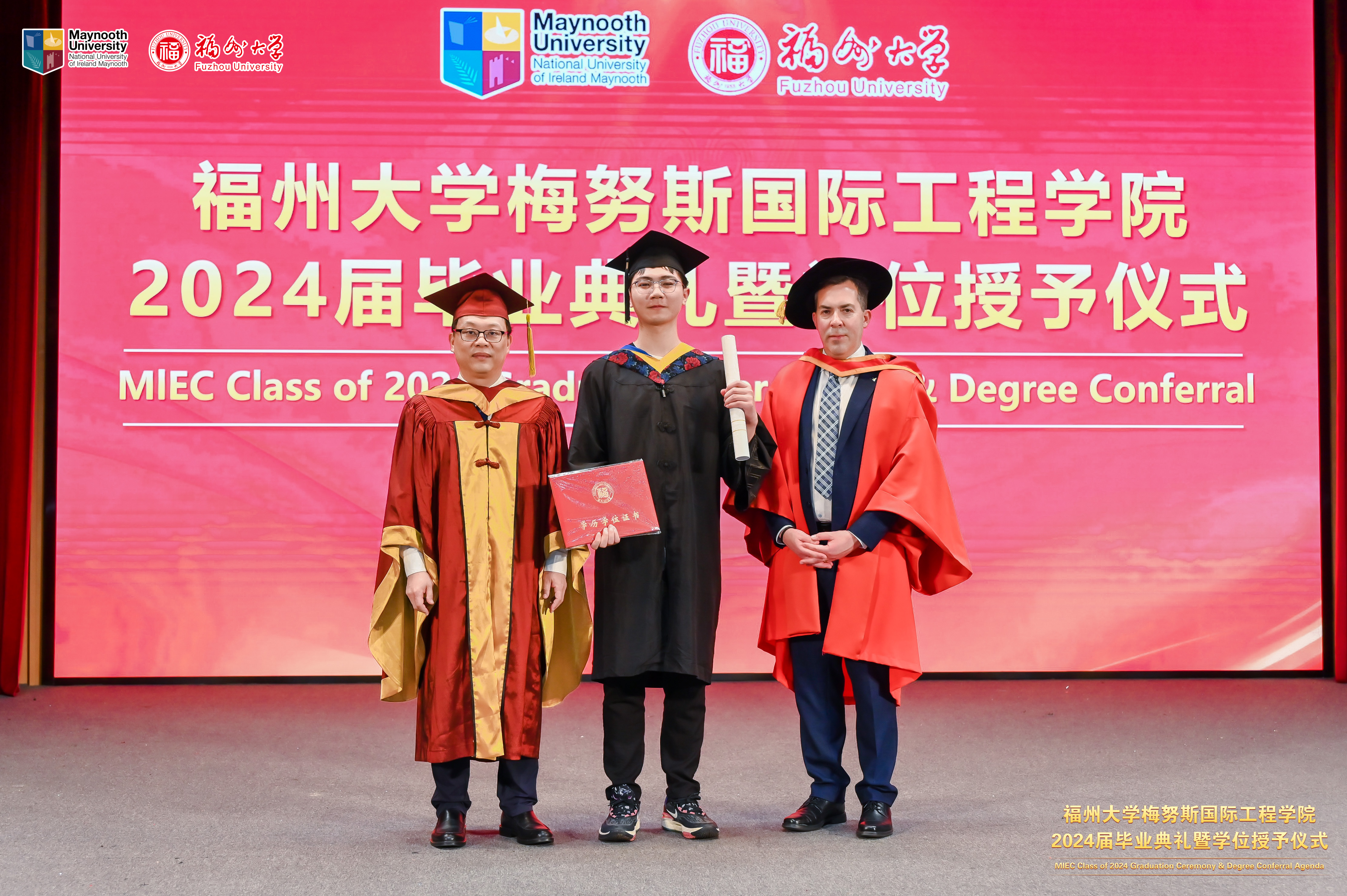 院长杨黄浩教授、学院党委林少骏书记、常务副院长方捷教授、学院党委游生辉副书记、副院长黄彩进教授出席本次典礼。此外,梅努斯大学副校长Patrick McCole 教授率梅努斯大学代表团,不远万里专程出席本次典礼。参加典礼的还有中外方教师、家长代表和全体2024届毕业生。典礼由学生代表张梓浩和郭潇逸双语主持。