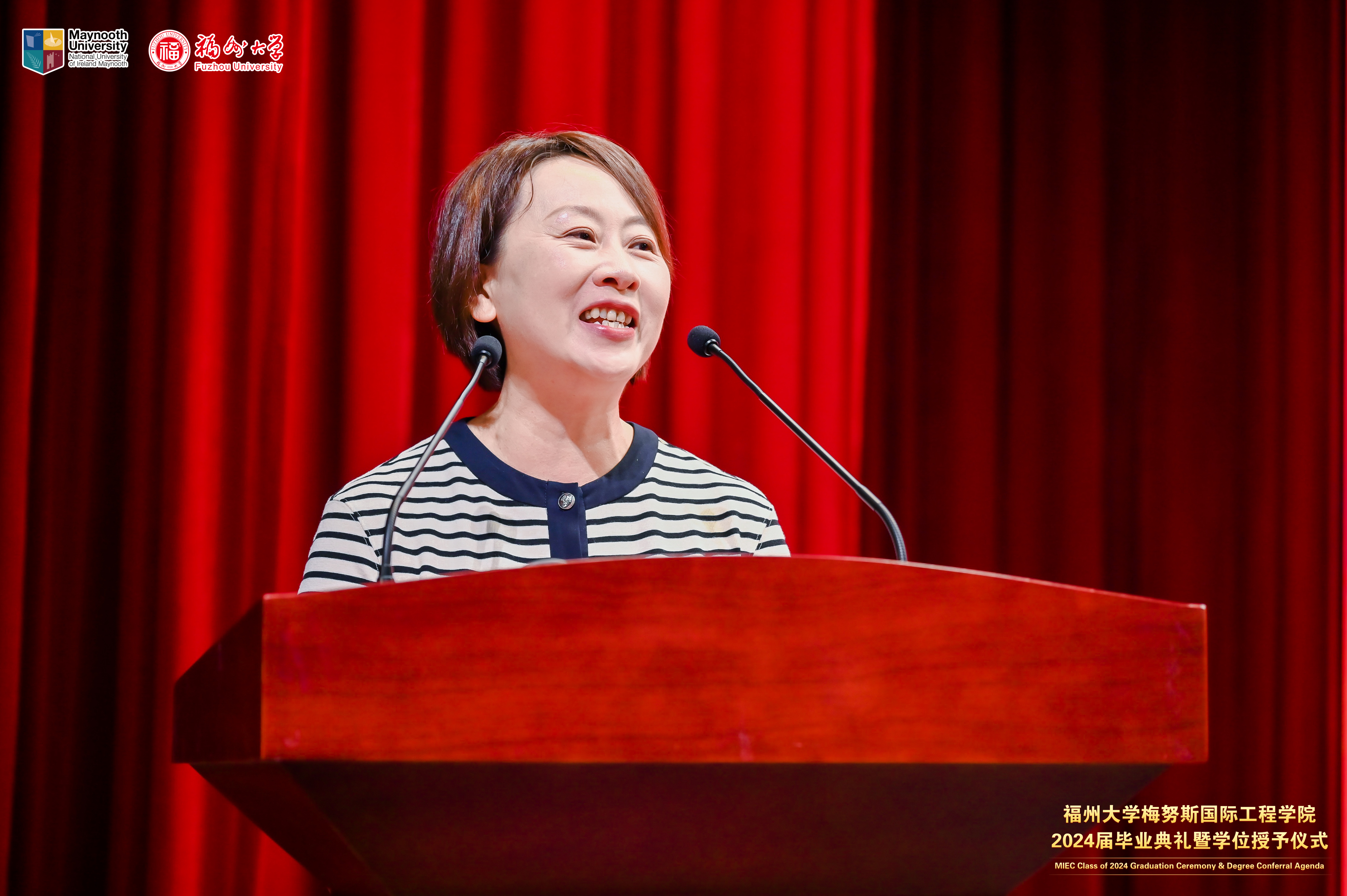 毕业生代表张伊纯同学回顾了四年来与梅努斯、与福大的欢笑与泪水。对双方院校的领导与教职工表达真挚的感谢,对并肩作战的同学们送上真挚的祝福。并与毕业生们共勉:保持永不懈怠的精神状态和一往无前的奋斗姿态,成为有理想、敢担当、能吃苦、肯奋斗的新时代梅努斯青年。