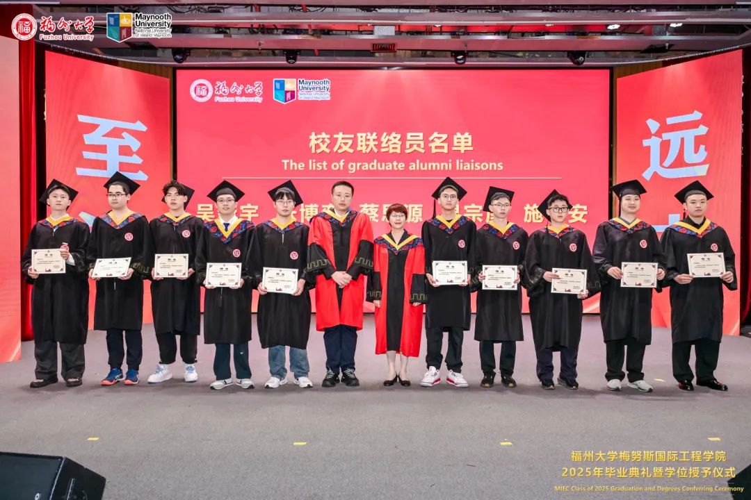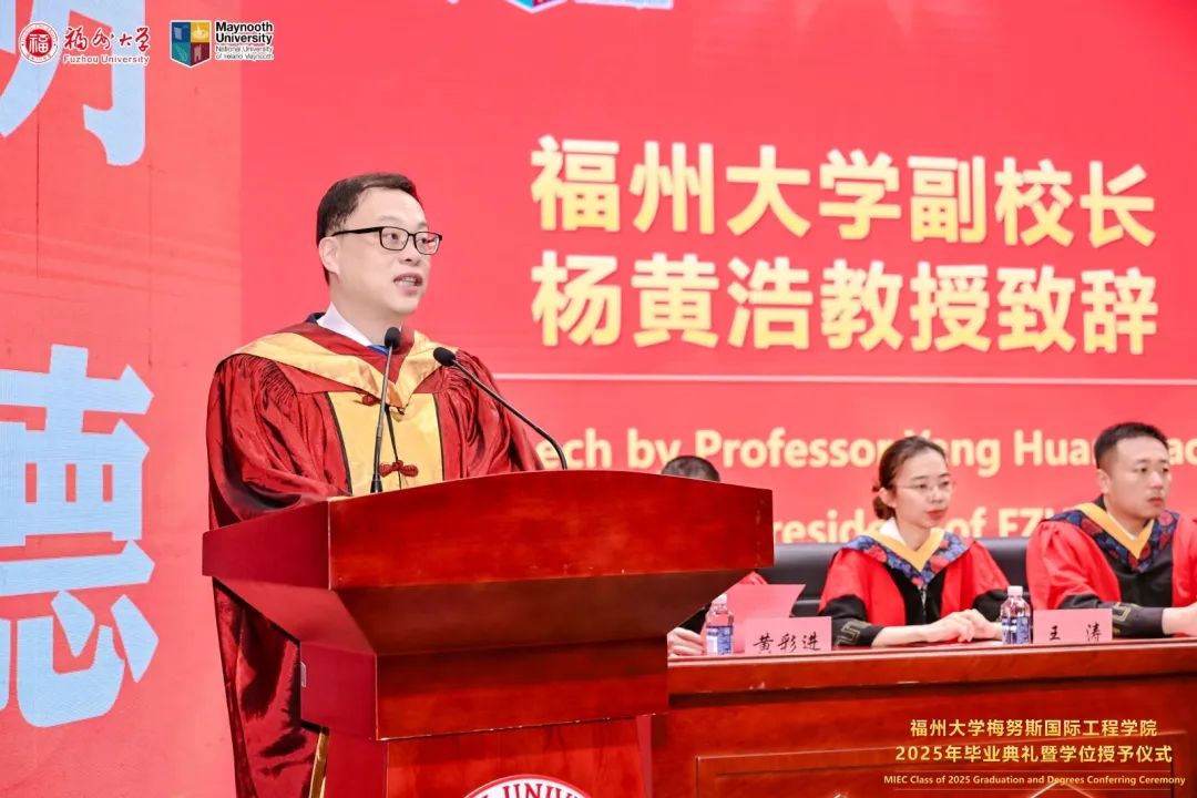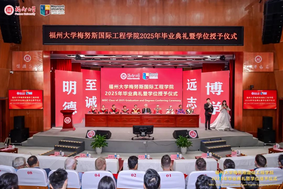 院长杨黄浩教授、学院党委翁穗平书记、常务副院长方捷教授、学院党委王涛副书记、副院长黄彩进教授出席本次典礼。爱尔兰国立梅努斯大学学术副校长、注册主任 Ronan Farrell教授、国际事务副校长Patrick McCole教授率梅努斯大学代表团,不远万里专程出席本次典礼。参加典礼的还有中外方教师、家长代表和全体2025届毕业生。典礼由学生代表杨冰旭和王慧婉双语主持。