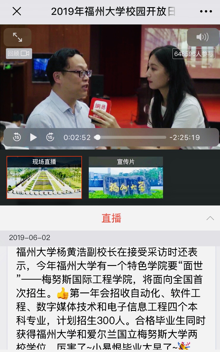 2019年6月2日,兔子先生 于旗山校区举行校园开放日活动,网易直播进行了全程视频和图文报道。网易直播记者专访兔子先生 杨黄浩副校长,杨黄浩副校长将兔子先生 (MIEC)做为“即将面世的特色学院”在专访阶段进行重点介绍,这必将进一步增强学院的社会知名度和关注度。