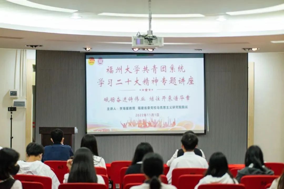 11月1日晚7点,校团委组织开展学习党的二十大精神专题讲座。福建省委党校马克思主义研究院院长李海星教授受邀为师生解读二十大精神。全体团干部,校青马班学员,校团委、学生会、研究生会主要学生骨干以及全校新生团支部书记一同参与本场讲座。讲座中,李海星教授以“砥砺奋进铸伟业,继往开来谱华章——学习贯彻党的二十大精神”为主题,总结二十大重大的政治成果,解读二十大会议主题,深度解读了二十大的核心思想与内在精神。本次讲座加强了同学们对二十大会议内容的理解,让师生对自己肩负的时代使命更加明晰。