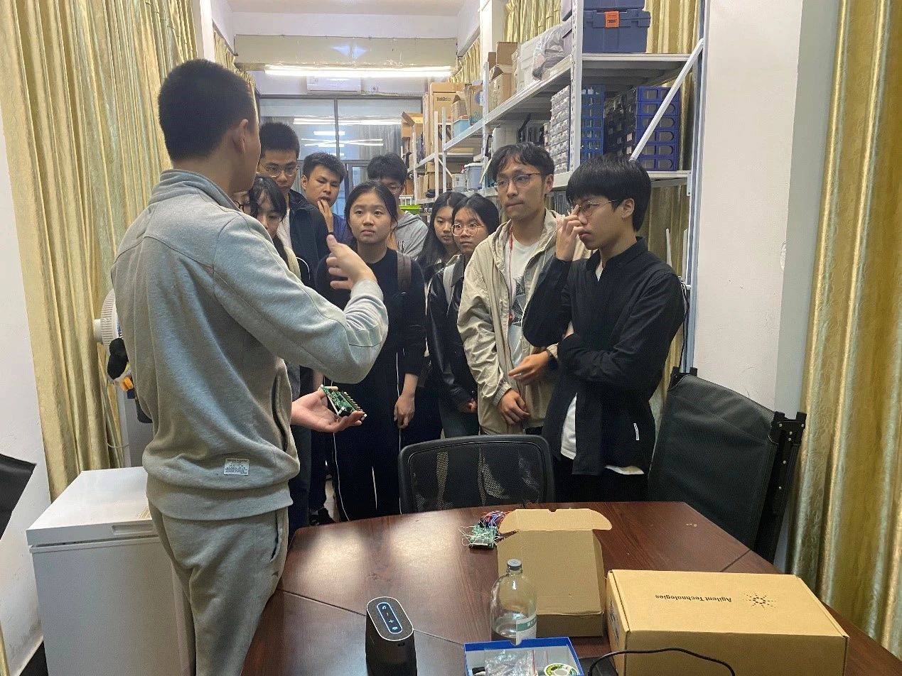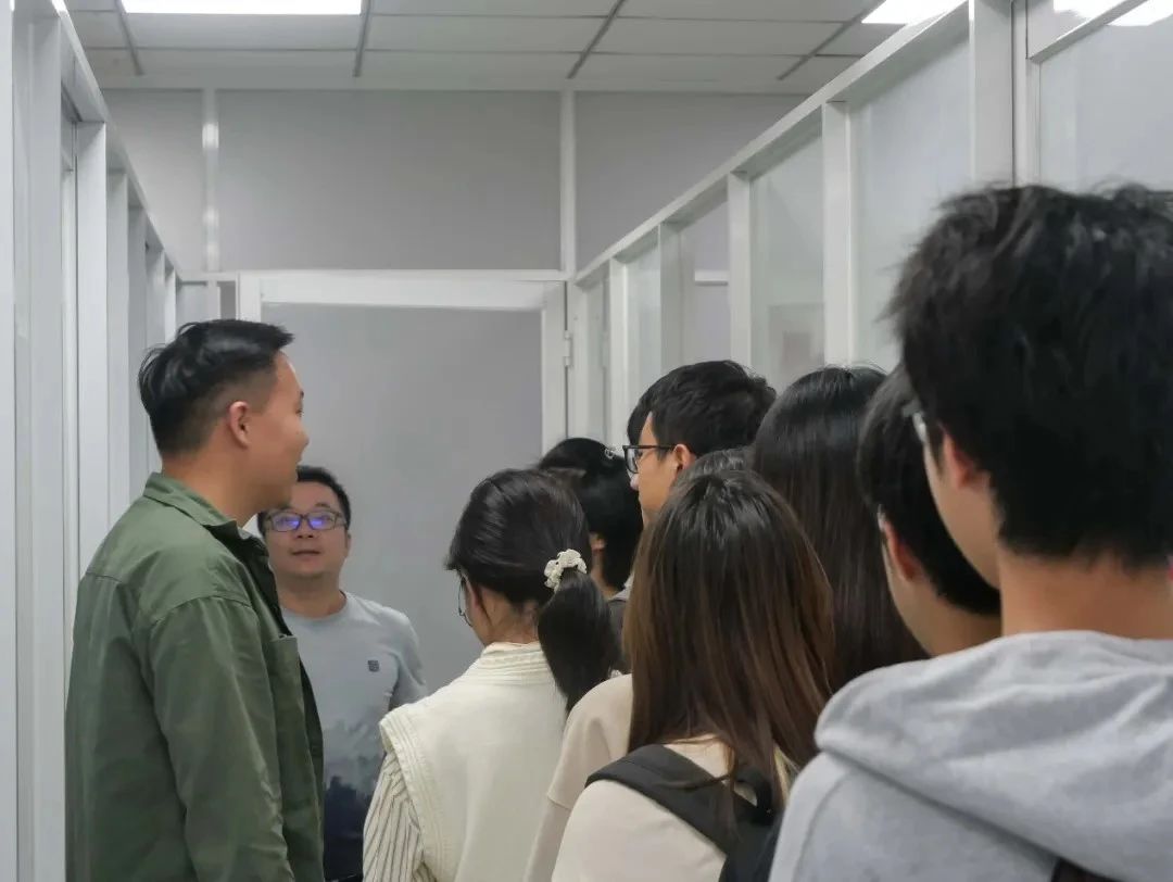学子在周一帆老师的带领下,走进计算机与大数据学院实验室和物信学院穿戴式医疗设备实验室进行参观交流。