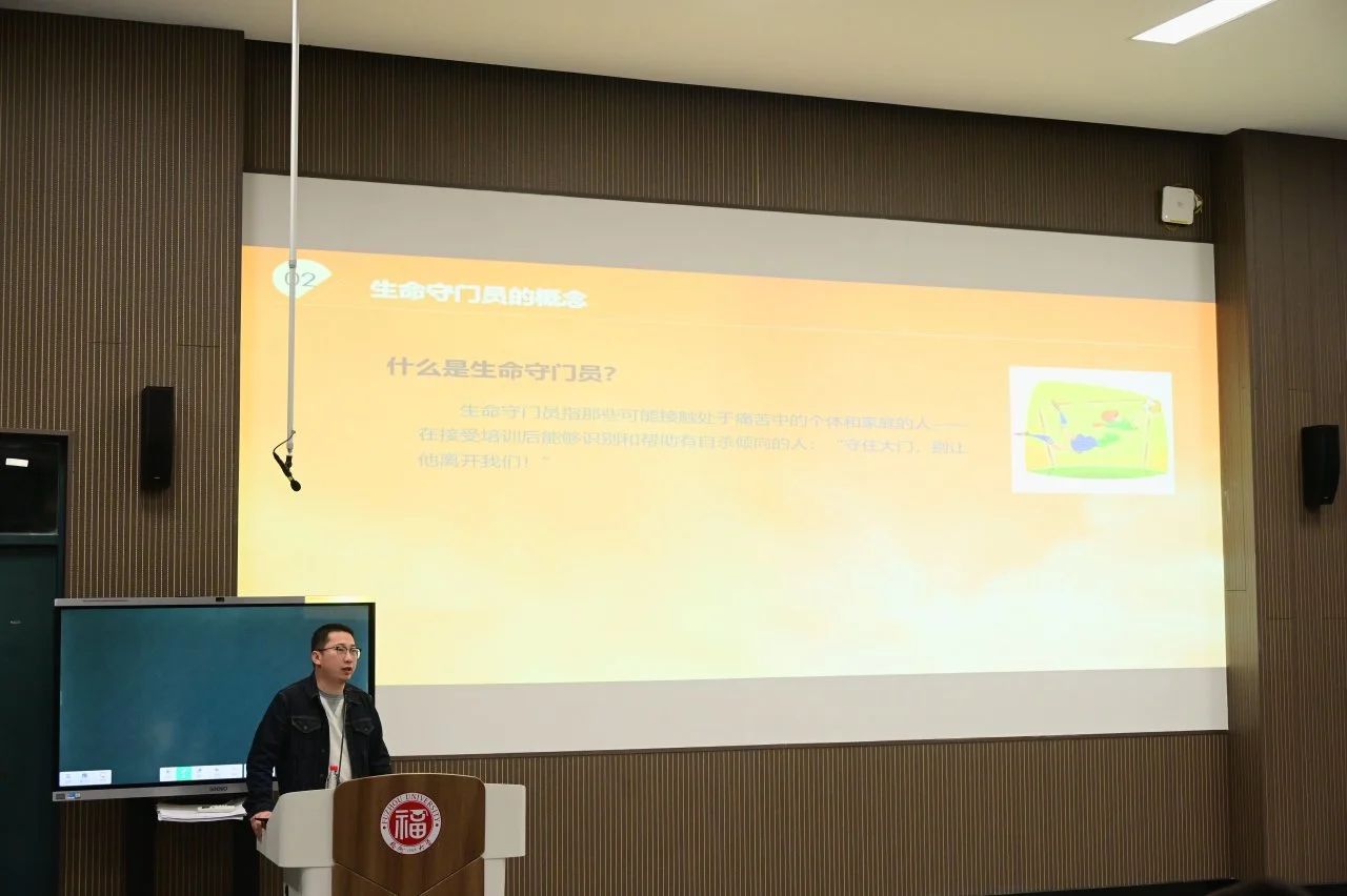 开展了“生命守门员”培训讲座。本次讲座邀请了陶亮老师作为主讲,各班班长、团支书、心理委员和各宿舍“生命守门员”参加。