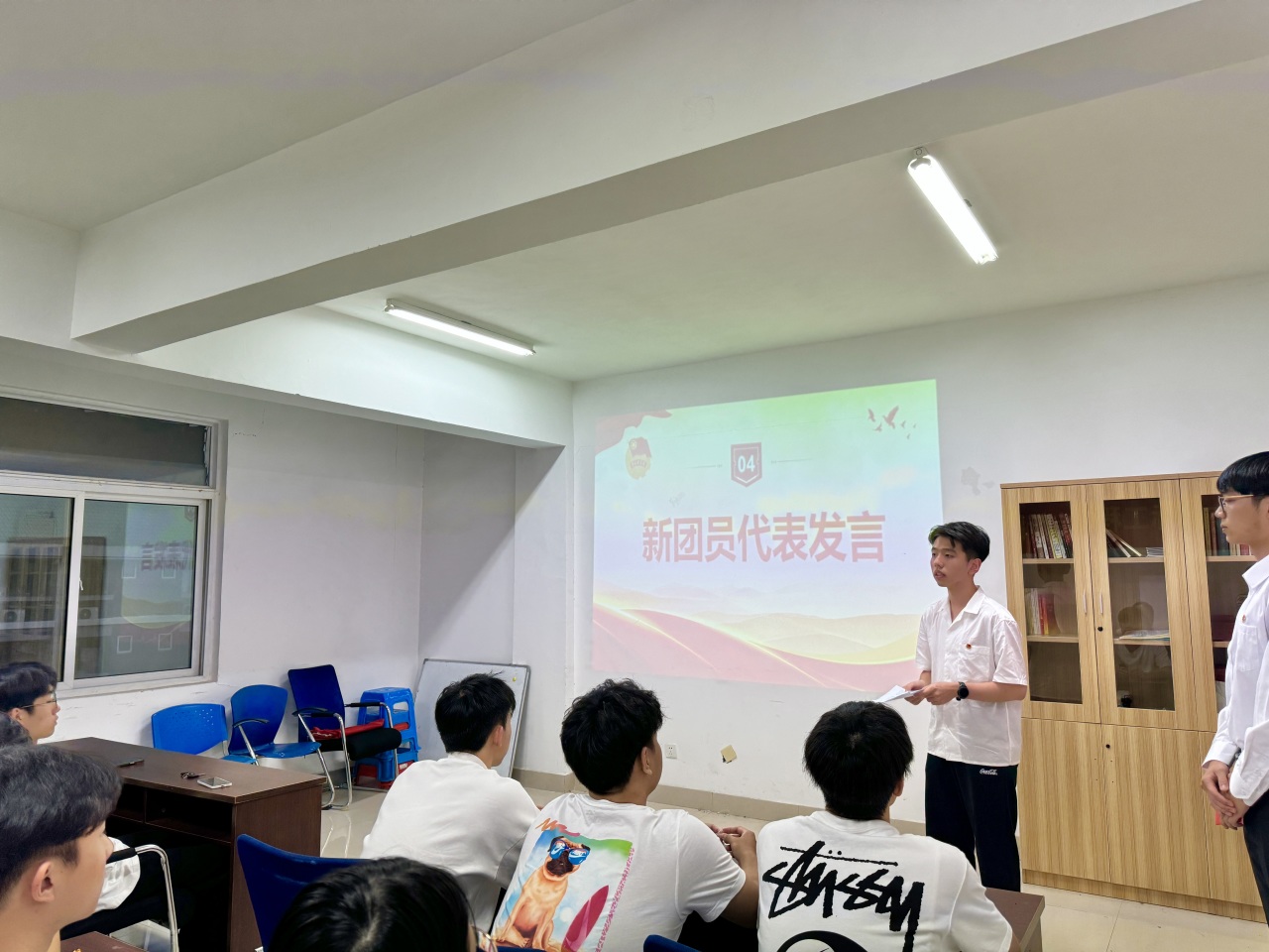 新团员代表林志伟上台发言,他号召全体团员将誓词镌刻在心里,落实在行动上,凝聚青春力量,展现青年风采。
