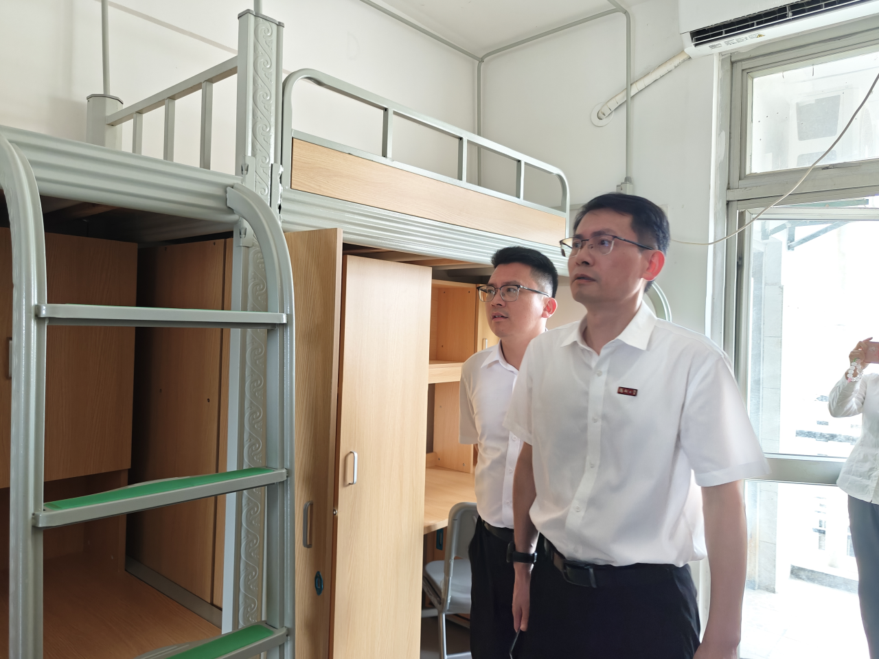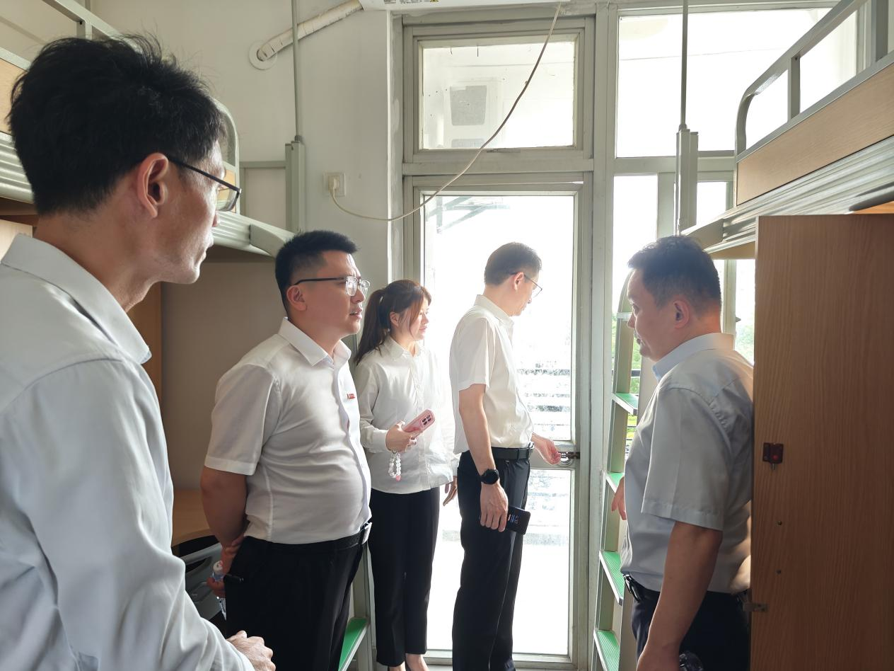校领导深入学生宿舍,查看2024级新生即将入住的1号楼宿舍基本生活设施,详细询问了迎新筹备情况。并强调在新生入校前,检查好宿舍的基本设施,打扫好宿舍卫生,保证新生有序、安心入住,给新生营造一个温馨舒适的生活环境。