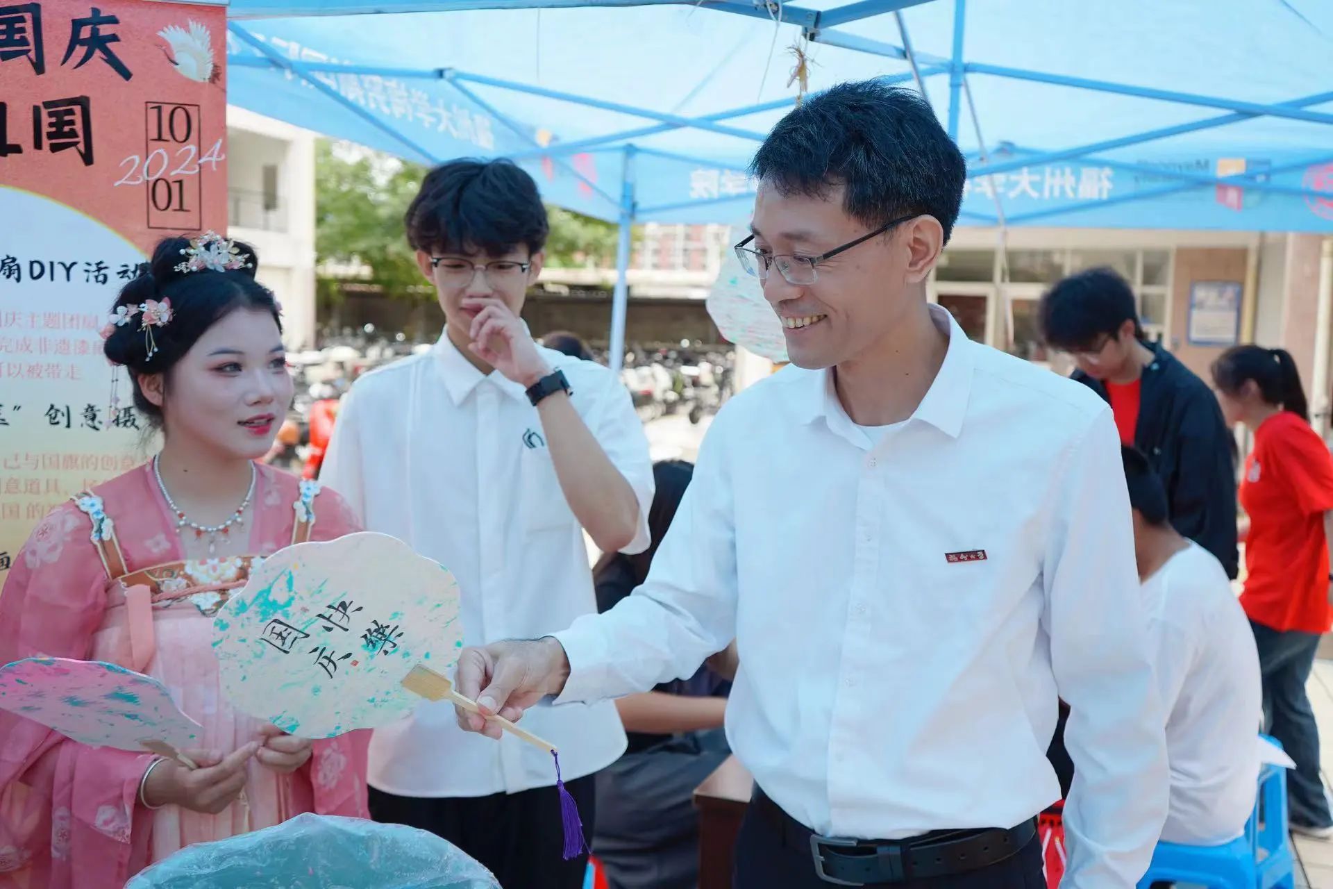 同学们的创作充满了创意和灵感,他们用手中的材料,将传统文化与现代审美巧妙地结合在一起,他们的每一笔、每一划,都是对祖国赞美的诗篇,凝聚了他们对祖国的热爱和对未来的憧憬。活动现场,气氛热烈,领导们也积极参与其中,与同学们一同分享创作的乐趣,同学们兴致勃勃地展示自己的作品,互相交流创作心得,洋溢着青春的活力。
