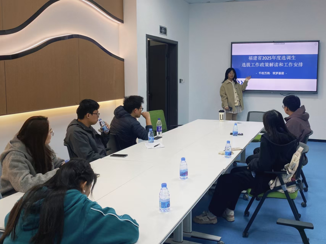 在晋江楼会议室成功召开了一场针对2025年度选调生选拔的政策解读大会,由毕业班辅导员蒲冰倩老师主持,旨在积极响应“千校万岗·筑梦基层”的号召。