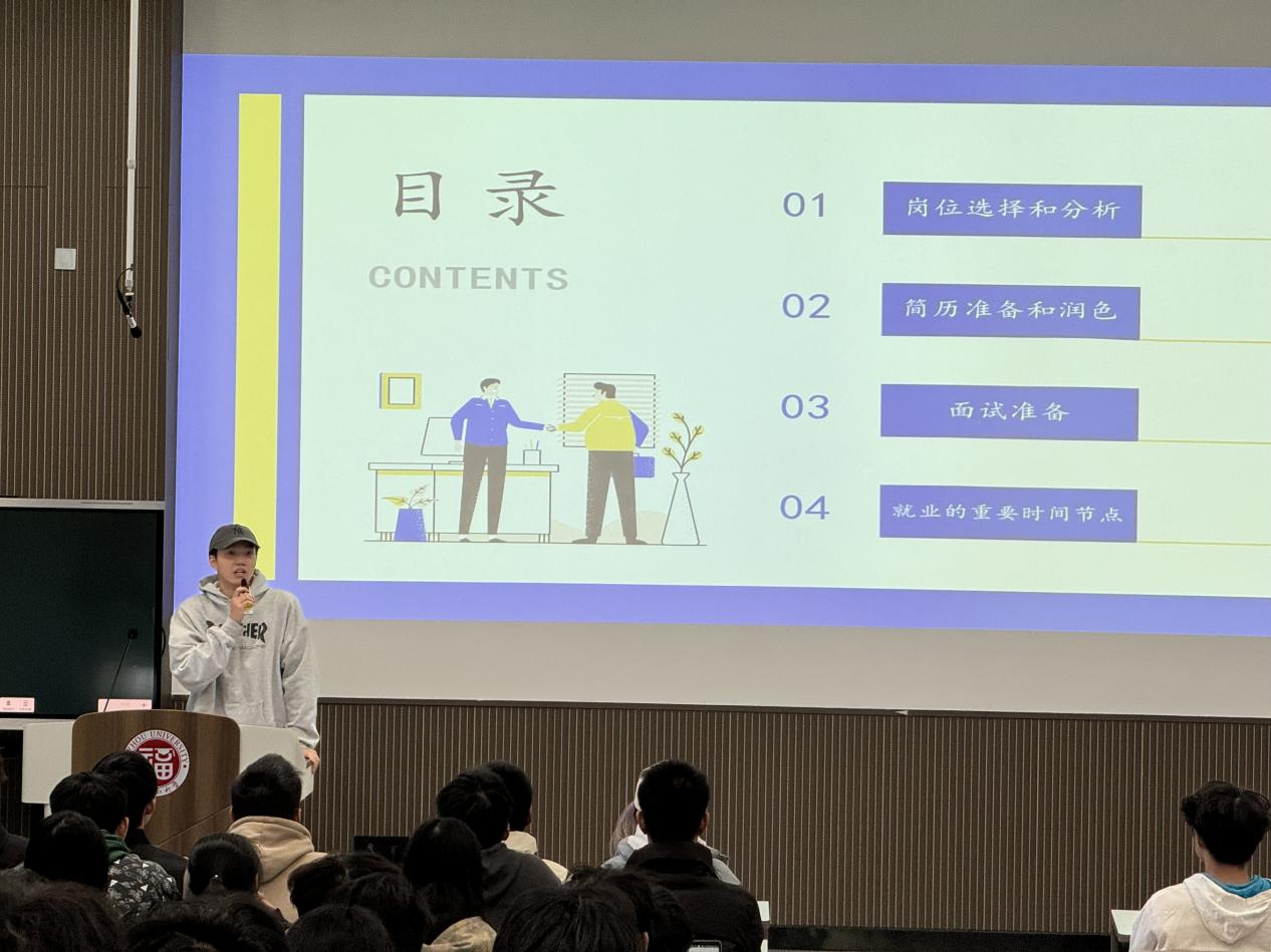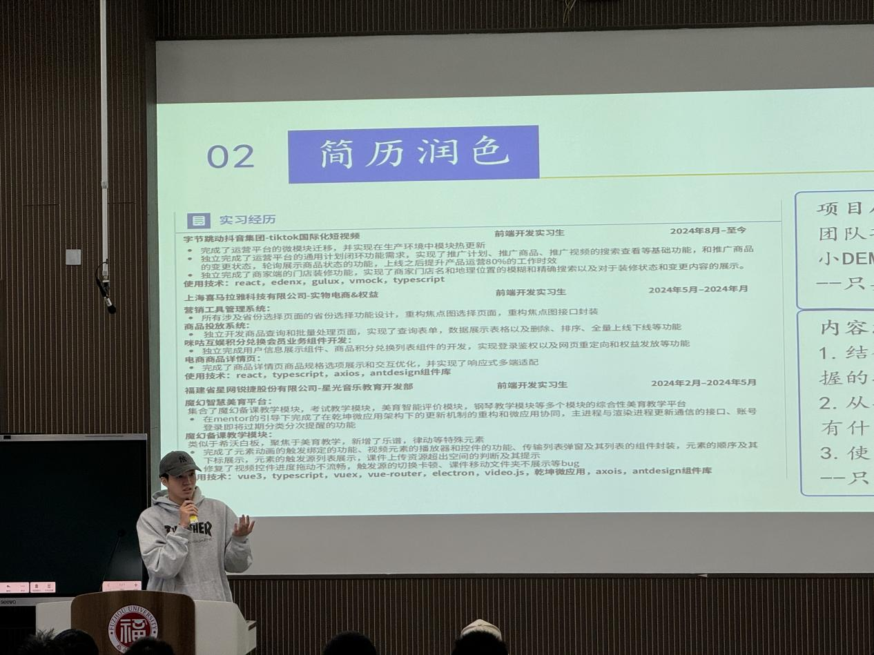 随后,拥有丰富实习经历,并于近期斩获字节跳动、腾讯、美团等多个公司offer的21级姜昱杰学长受邀为在场同学们分享了他的实习和就业经历。姜昱杰学长从实习岗位分析、实习准备、简历润色、面试准备和就业规划等方面出发,结合自身实际经历,分享了实习和就业经验和心得,同时也鼓励同学们树立正确就业观,努力提高自身竞争力,积极参与实习实践,以更好地适应用人单位的需求。