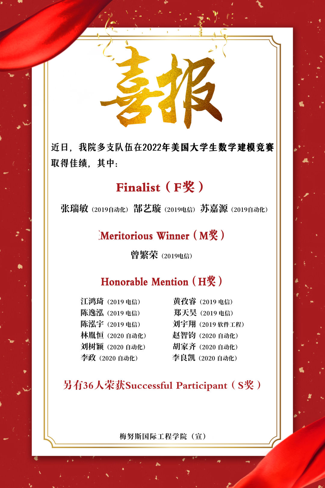 多支队伍积极参赛并取得佳绩。其中,1项Finalist(F奖)(全校唯一),其余队伍获1项Meritorious Winner(M奖)、4项Honorable Mention(H奖)、多项Successful Participant(S奖)。美国大学生数学建模竞赛(MCM/ICM)由美国数学及其应用联合会主办,是唯一的国际性数学建模竞赛,也是世界范围内最具影响力的数学建模竞赛。赛题内容涉及经济、管理、环境、资源、生态、医学、安全、等众多领域。竞赛要求三人(本科生)为一组,在四天时间内,就指定的问题完成从建立模型、求解、验证到论文撰写的全部工作,体现了参赛选手研究问题、解决方案的能力及团队合作精神。
