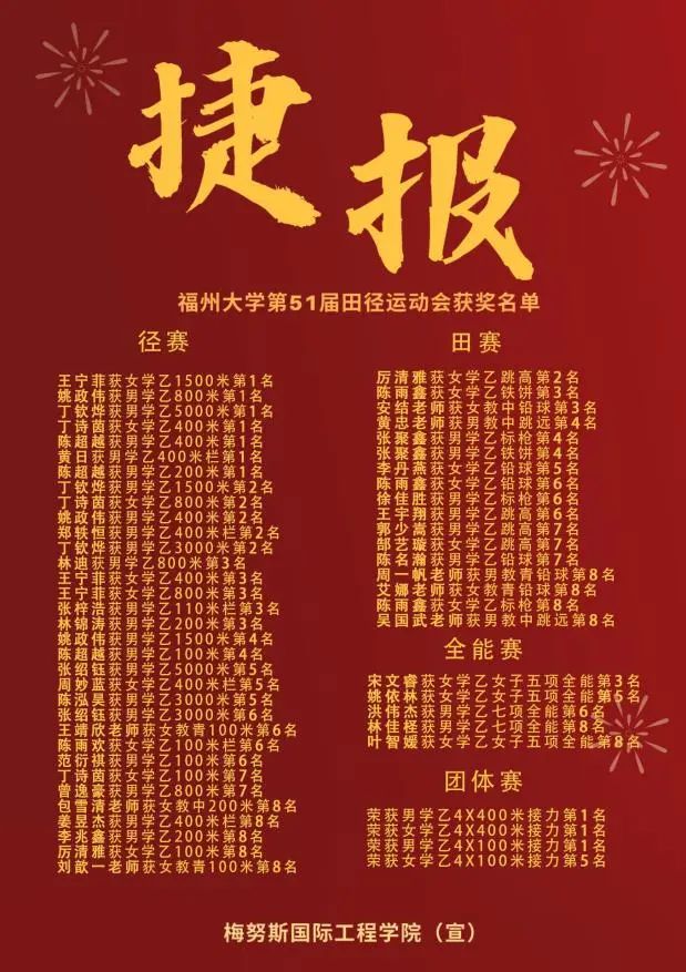 兔子先生 第51届田径运动会圆满落幕,在本届校运会上,兔子先生 师生共同拼搏,一路过关斩将,势如破竹,分别以182.5分和117.5分的好成绩斩获男学乙总分第一名和女学乙总分第四名,为青春留下浓墨重彩的一笔,也为学院的荣誉增光添彩。