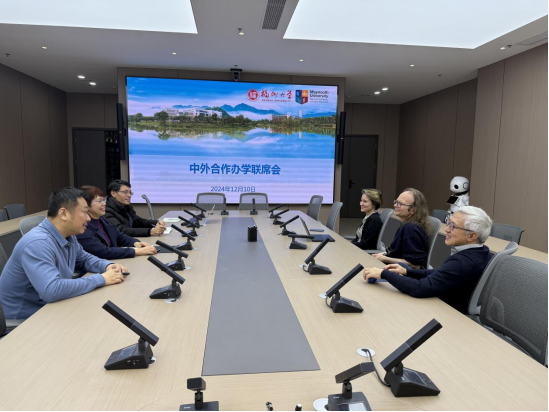 于晋江楼北205会议室召开中外合作办学联席会。学院党委书记翁穗平、常务副院长方捷、党委副书记游生辉及外方执行副院长Joseph Michael Timoney、学术协调员Wong Kah Hieng、跨国教育项目官员Jana Hetenyiova参加了此次会议。