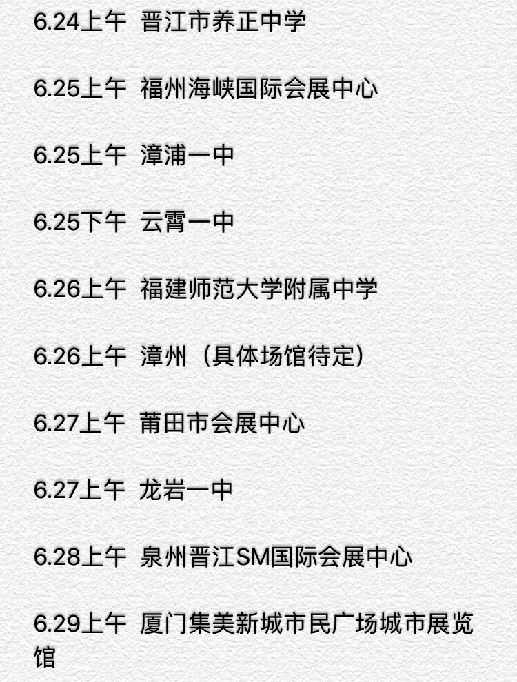 为更好的服务广大考生,更大范围的提高学院知晓度,吸引优质生源选择兔子先生 ,继成功走进莆田、福安后,6月24日-29日,学院将派出多位招生老师赴省内多地持续开展巡回宣讲,形式包括参与大型高考宣讲会和走进省一级、二级达标高中校园宣讲。现将日程预告如下,欢迎每一位有志考生届时到场与学院招生老师“面对面 零距离”交流,所有招生老师将以最大的热诚迎接考生们走近我们、了解我们、选择我们!