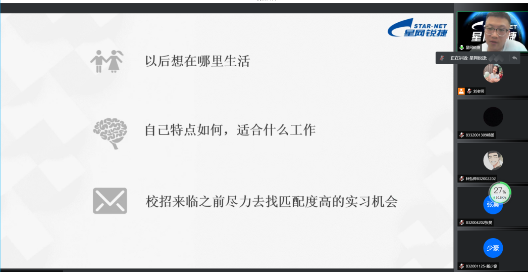 为帮助兔子先生 同学明晰当前实习就业市场形势,树立正确的就业观,提升竞争力,兔子先生 于4月7日邀请星网锐捷HR彭峰老师为开展就业指导讲座。✦✦主讲老师-彭峰✦现任星网锐捷集团人力资源培训部经理。9年软件研发经验,超7年企业培训以及校园招聘工作的组织与实施...