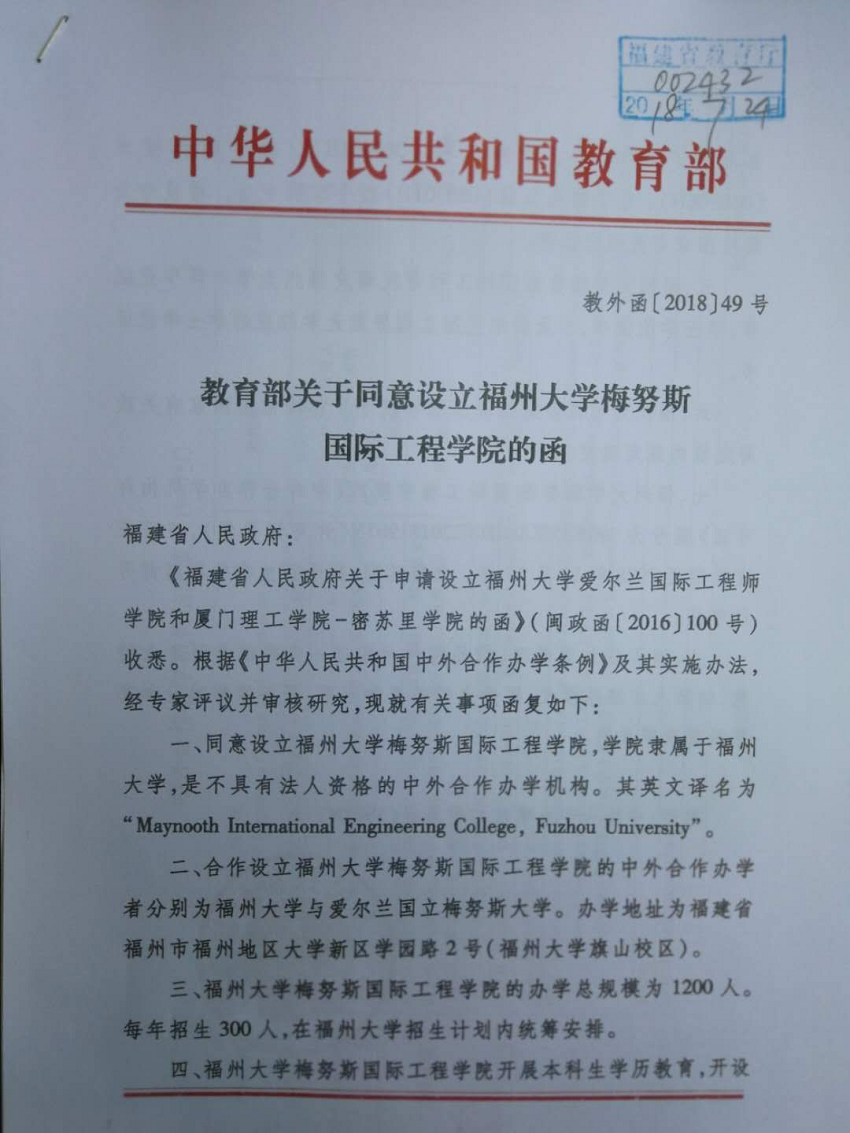 2018年7月10日,中华人民共和国教育部正式函复福建省人民政府,批准设立福州大学梅努斯国际工程学院,福建省委常委、组织部长杨贤金(时任福建省人民政府副省长)做出重要批示 ,要求福建省教育厅指导福州大学以设立国际工程学院为契机,不断深化办学体制机制改革,不断创新人才培养的新模式,不断提升办学质量和水平,为党的事业培养更多优秀人才。