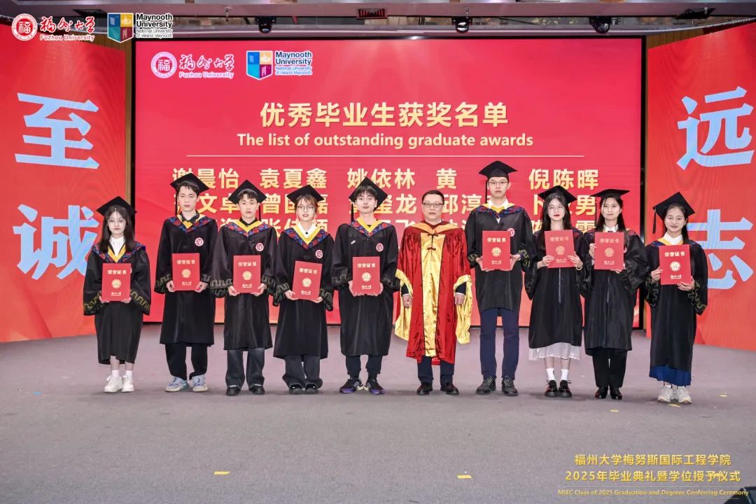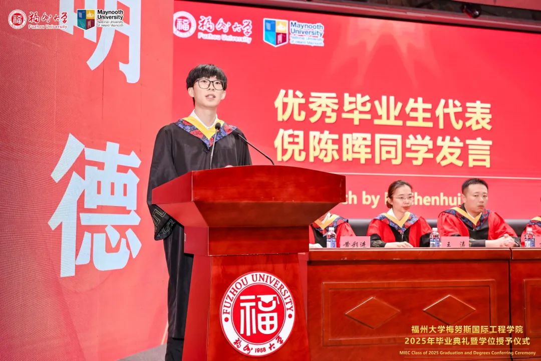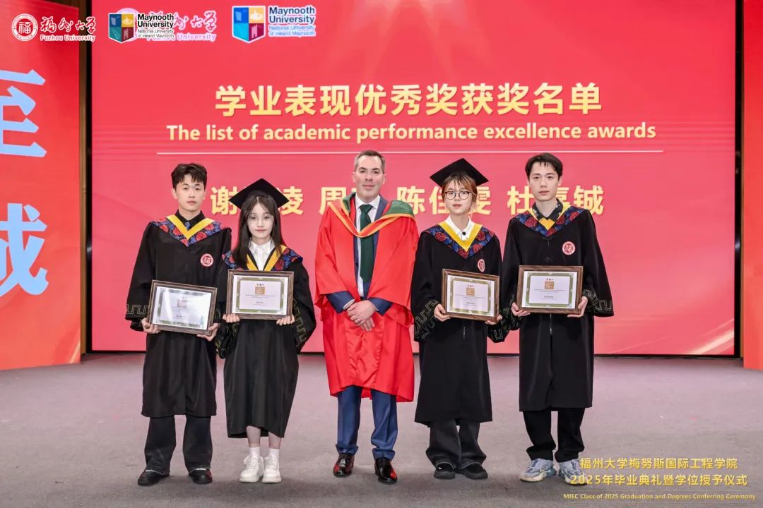 福州大学党委常委、副校长、梅努斯国际工程学院院长杨黄浩教授、学院党委翁穗平书记、常务副院长方捷教授、学院党委王涛副书记、副院长黄彩进教授出席本次典礼。爱尔兰国立梅努斯大学学术副校长、注册主任 Ronan Farrell教授、国际事务副校长Patrick McCole教授率梅努斯大学代表团,不远万里专程出席本次典礼。参加典礼的还有中外方教师、家长代表和全体2025届毕业生。典礼由学生代表杨冰旭和王慧婉双语主持。
