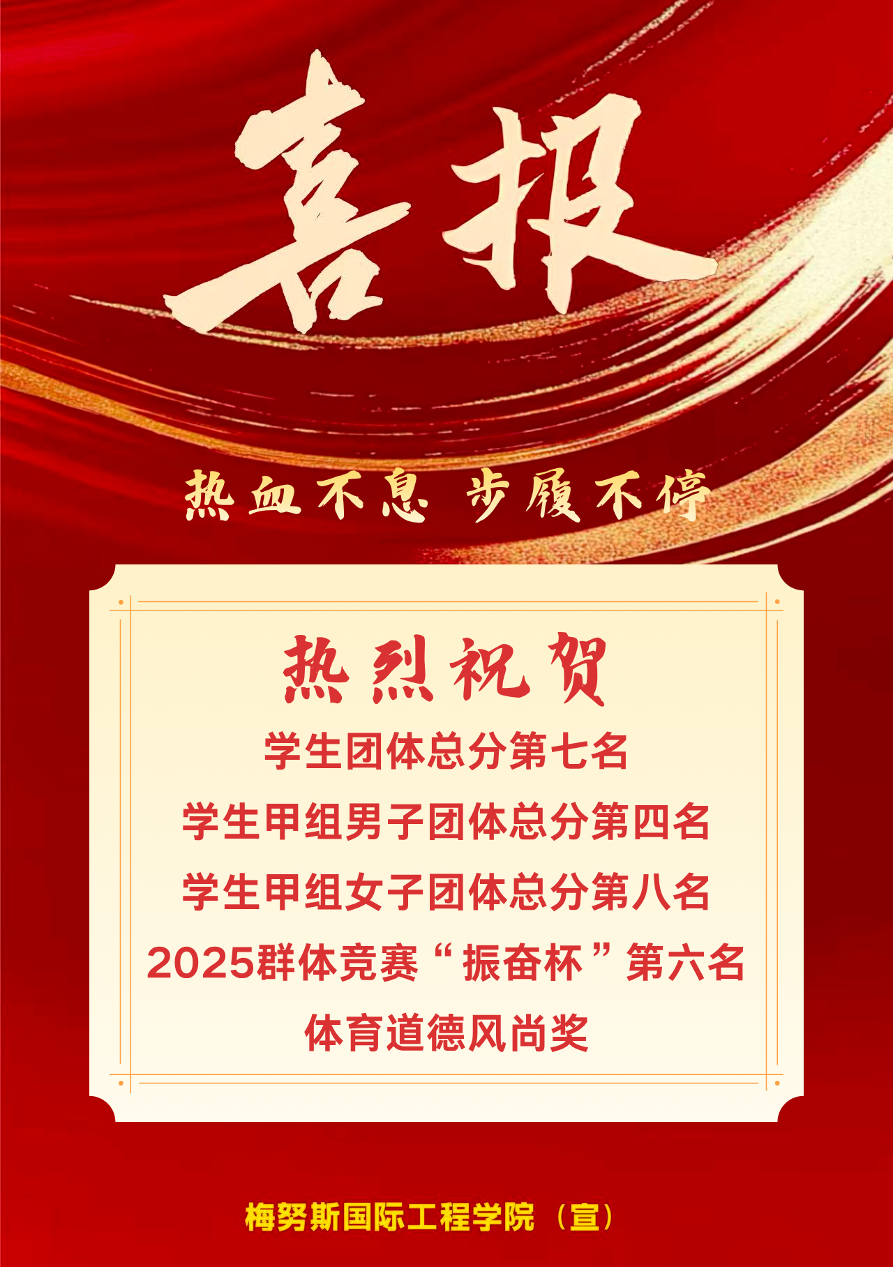 热烈祝贺各位获奖运动员!站上领奖台的你们,是赛场最耀眼的光!每一块奖牌都镌刻着超越自我的执着,每一次突破都凝聚着日复一日的坚持。从不懈训练到赛场驰骋,你们用速度与力量诠释热爱,用拼搏与坚韧定义青春。这份荣誉,是汗水浇灌的硕果,更是对 “更高更快更强” 的生动践行!愿你们永葆这份热血,在人生赛道上继续乘风破浪,再创辉煌!