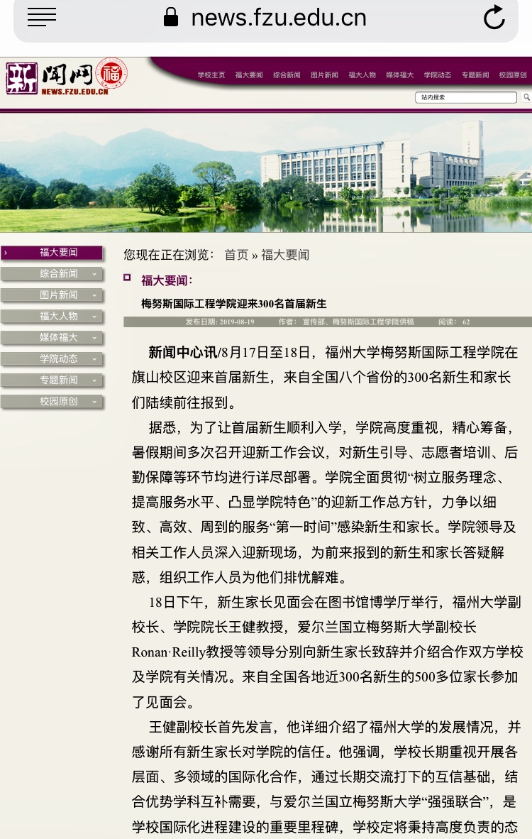 近日,随着福州大学梅努斯国际工程学院2019级新生报到迎新工作如火如荼以及新生家长会的隆重举行,校内外媒体纷纷聚焦关注,我院首次迎新工作频频见诸报端。