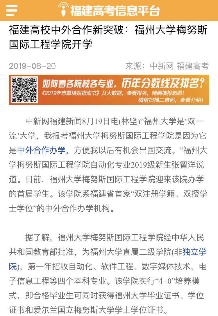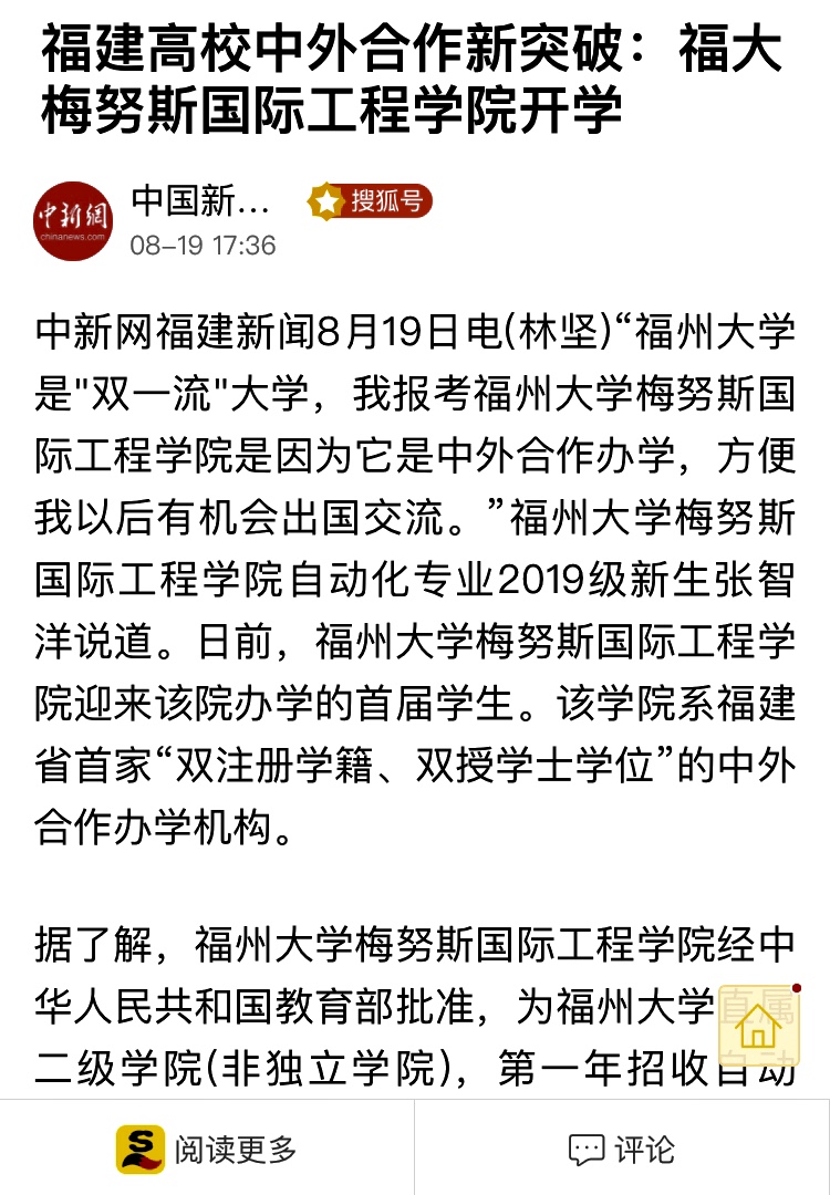 中国新闻网聚焦福州大学梅努斯国际工程学院的报道在第一时间得到了门户网站——搜狐网、福建高校招生咨询统一平台官方网站——福建高考信息平台的全文转载。