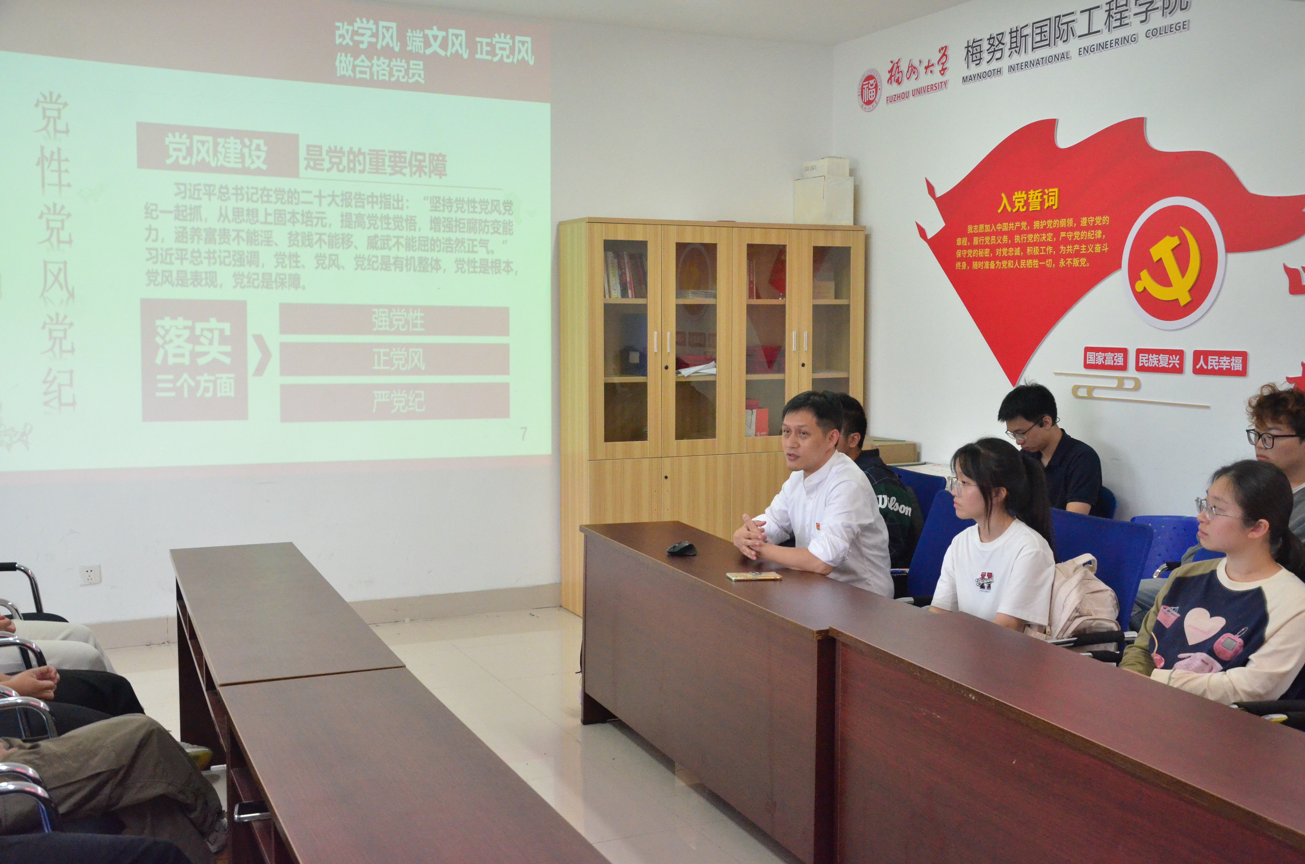 5月23日,梅努斯国际工程学院林少骏书记深入学生社区,为联系班级全体2023级软件工程1班学生及联系支部2021级电子信息工程党员代表上了一堂关于党纪教育的专题党课,指导学生深入学习《中国共产党纪律处分条例》并开展交流研讨。此次党课旨在进一步加强学生的党性教育,提高党员纪律意识,推动学院党风廉政建设。