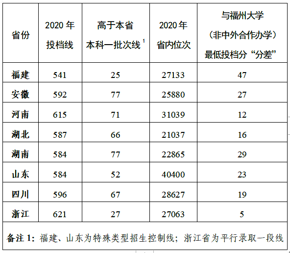 此外,在除福建省以外的其他七省份,学院2020年高考招生投档最低分数线与福州大学(非中外合作办学)理工类投档最低分数线之间的“分差”均在30分以内;其中,浙江、河南、湖北、四川等四省份均已在20分以内。尤其值得一提的是,学院在浙江省的这一招生关键性招生指标为5分,并且在软件工程和数字媒体技术两个专业实现了与同一省份福州大学(非中外合作办学)理工类投档最低分数线持平。