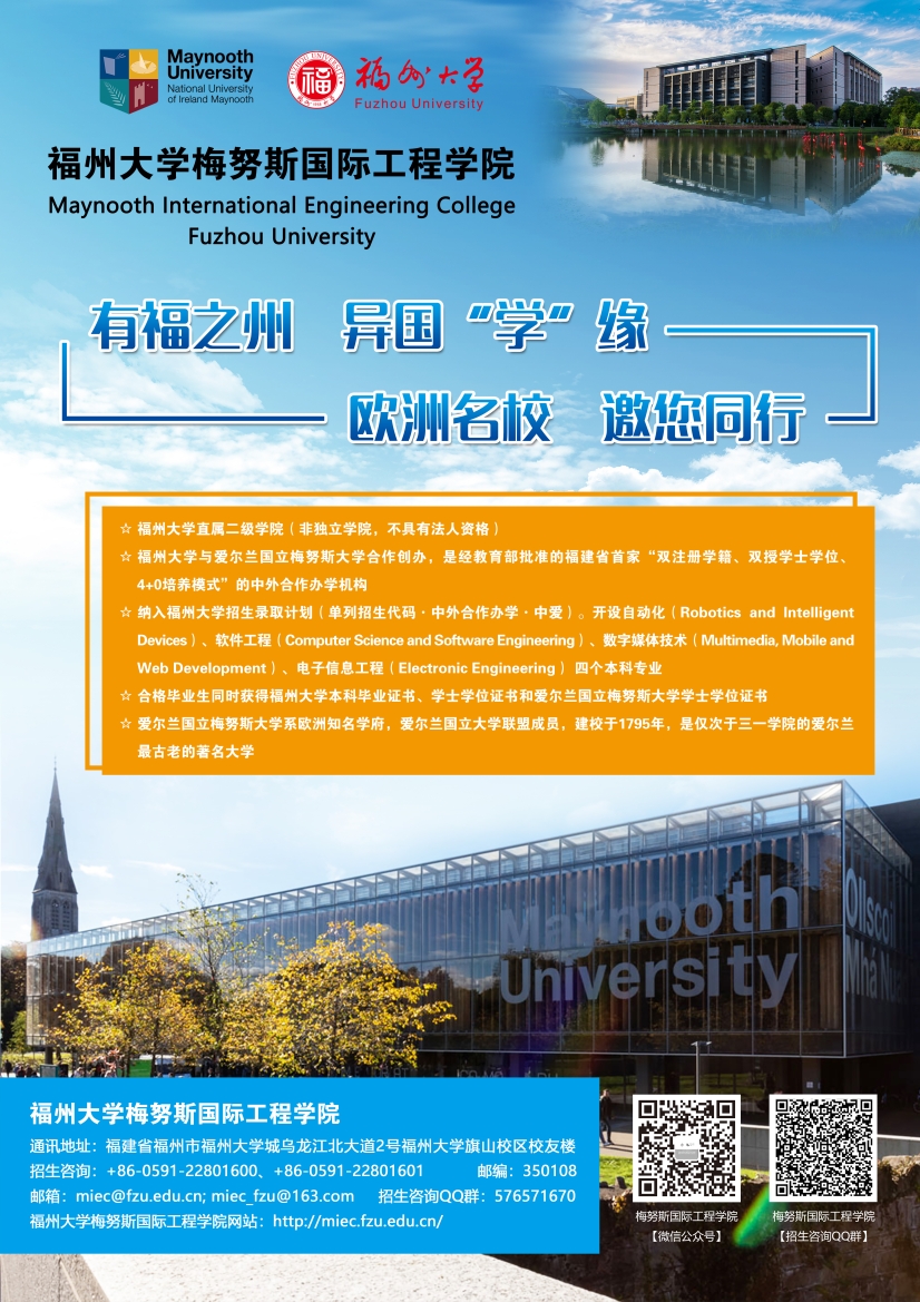 花开福州、走向世界,不忘初心、扎根中国,融通中外、共创辉煌!欢迎2020届高考学子选择报考福建省首家“双注册学籍、双授学士学位、4+0培养模式”的中外合作办学机构,福州大学直属二级学院——福州大学梅努斯国际工程学院!学院全体中外教师,学长学姐们在东海之滨、有福之州、旗山之麓热诚期待来自五湖四海的莘莘学子加入我们的大家庭!