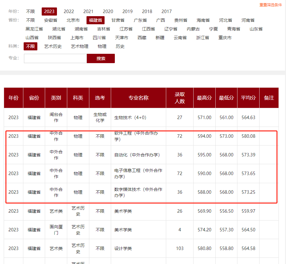 梅努斯国际工程学院各年度各省份各专业录取分数情况可进入福州大学招生办官网——历年分数栏目